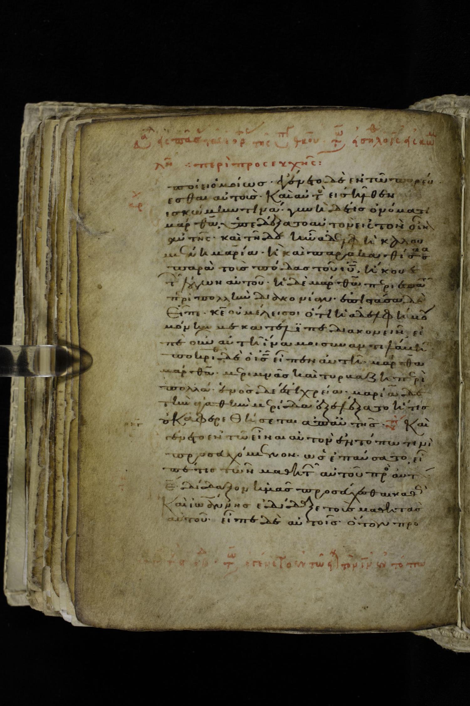 Eleventh century minuscule of the Gospels on parchment; 262 leaves, single column, 22-23 lines per column. Images were taken at the Hellenic Parliament Library in Athens.