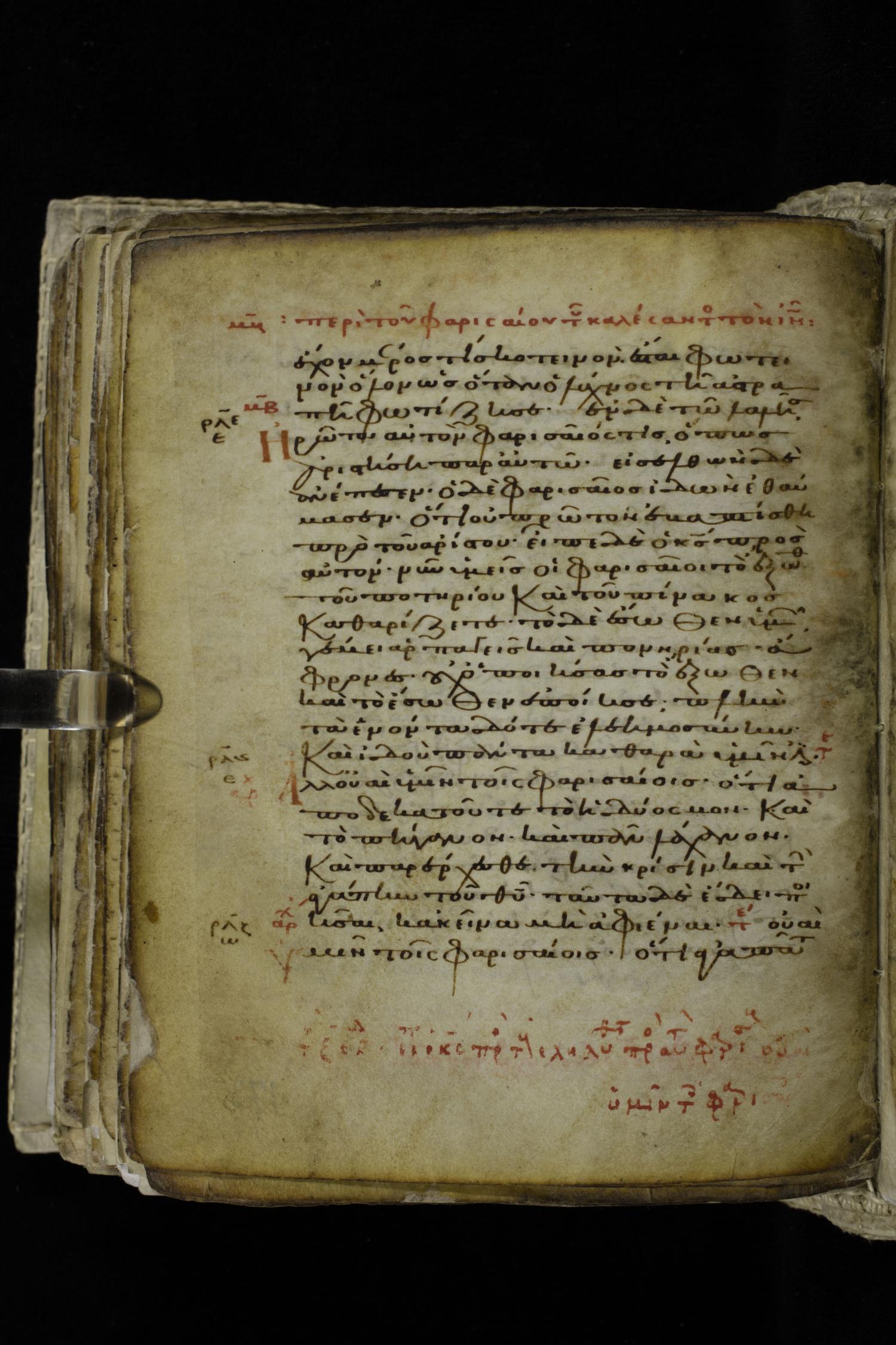 Eleventh century minuscule of the Gospels on parchment; 262 leaves, single column, 22-23 lines per column. Images were taken at the Hellenic Parliament Library in Athens.