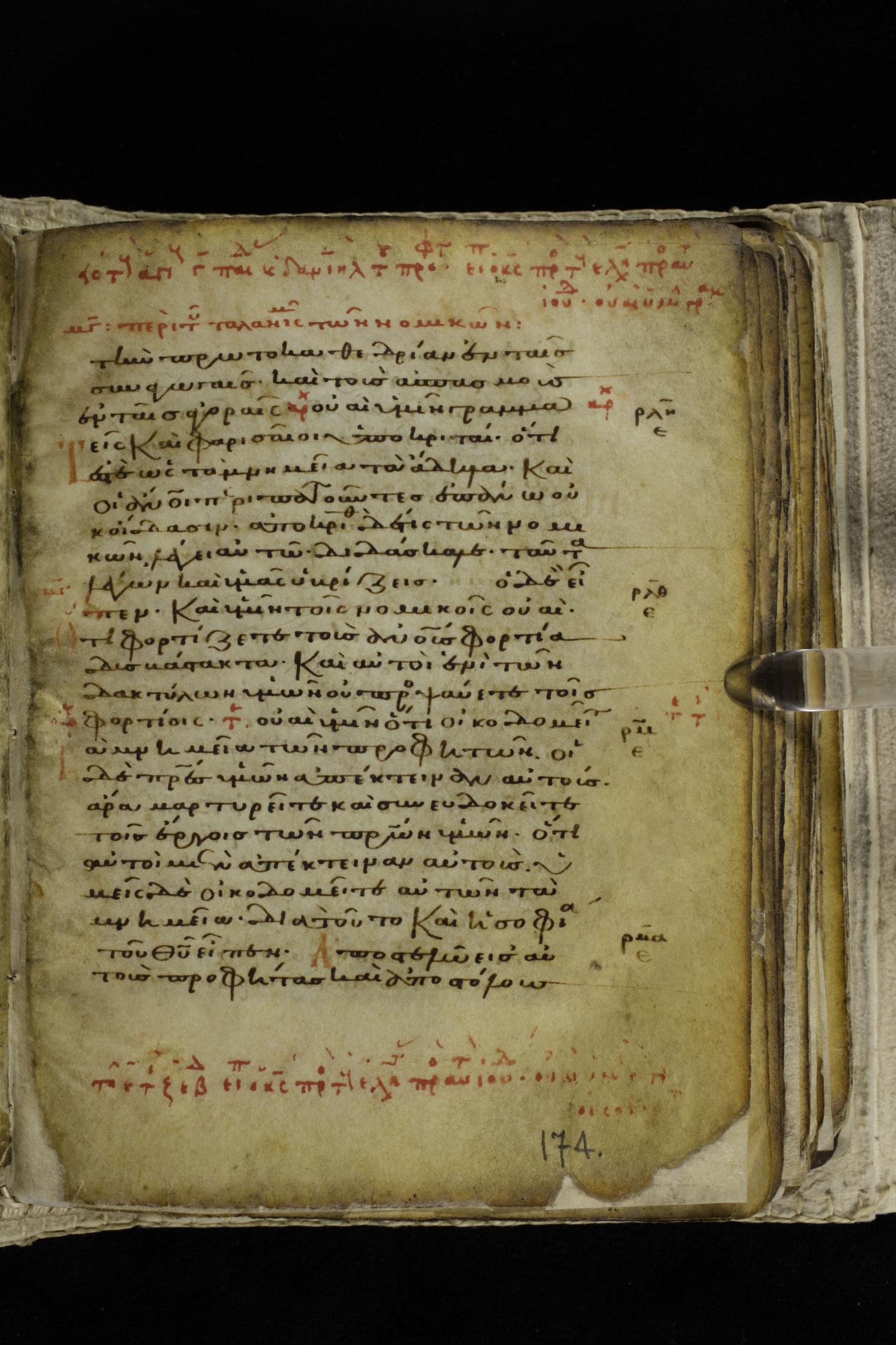 Eleventh century minuscule of the Gospels on parchment; 262 leaves, single column, 22-23 lines per column. Images were taken at the Hellenic Parliament Library in Athens.