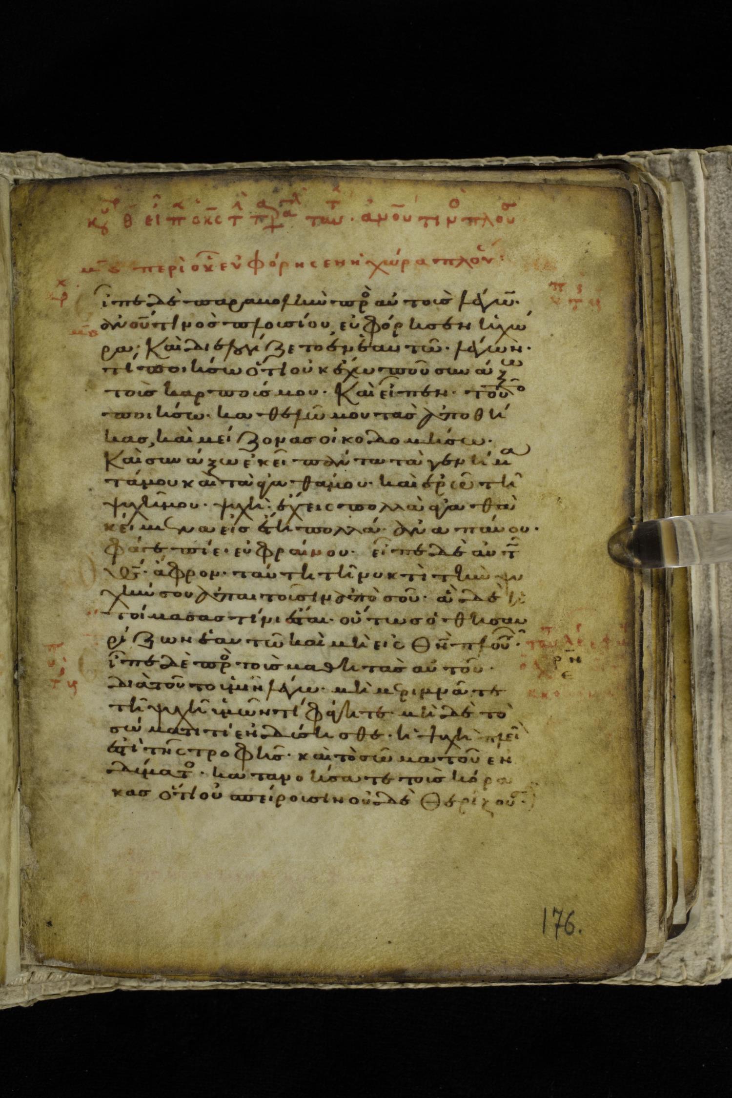 Eleventh century minuscule of the Gospels on parchment; 262 leaves, single column, 22-23 lines per column. Images were taken at the Hellenic Parliament Library in Athens.