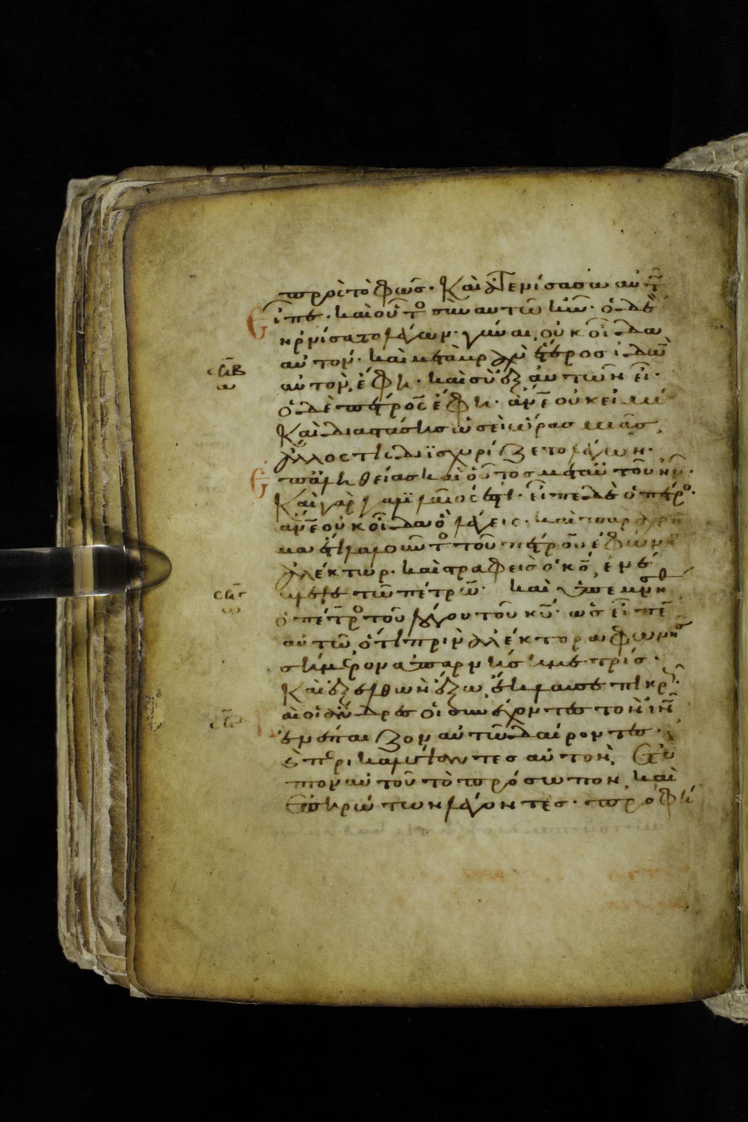 Eleventh century minuscule of the Gospels on parchment; 262 leaves, single column, 22-23 lines per column. Images were taken at the Hellenic Parliament Library in Athens.