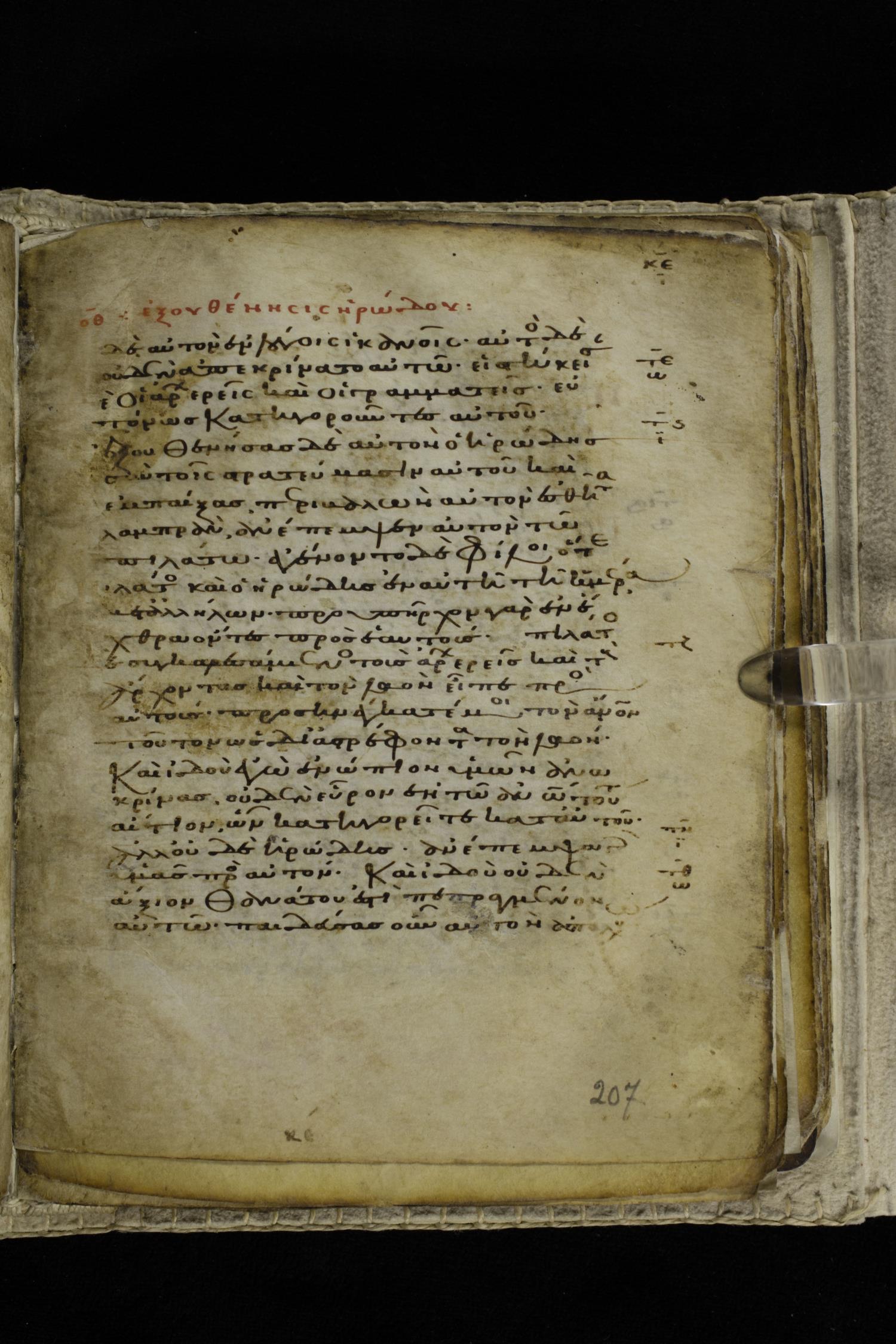 Eleventh century minuscule of the Gospels on parchment; 262 leaves, single column, 22-23 lines per column. Images were taken at the Hellenic Parliament Library in Athens.
