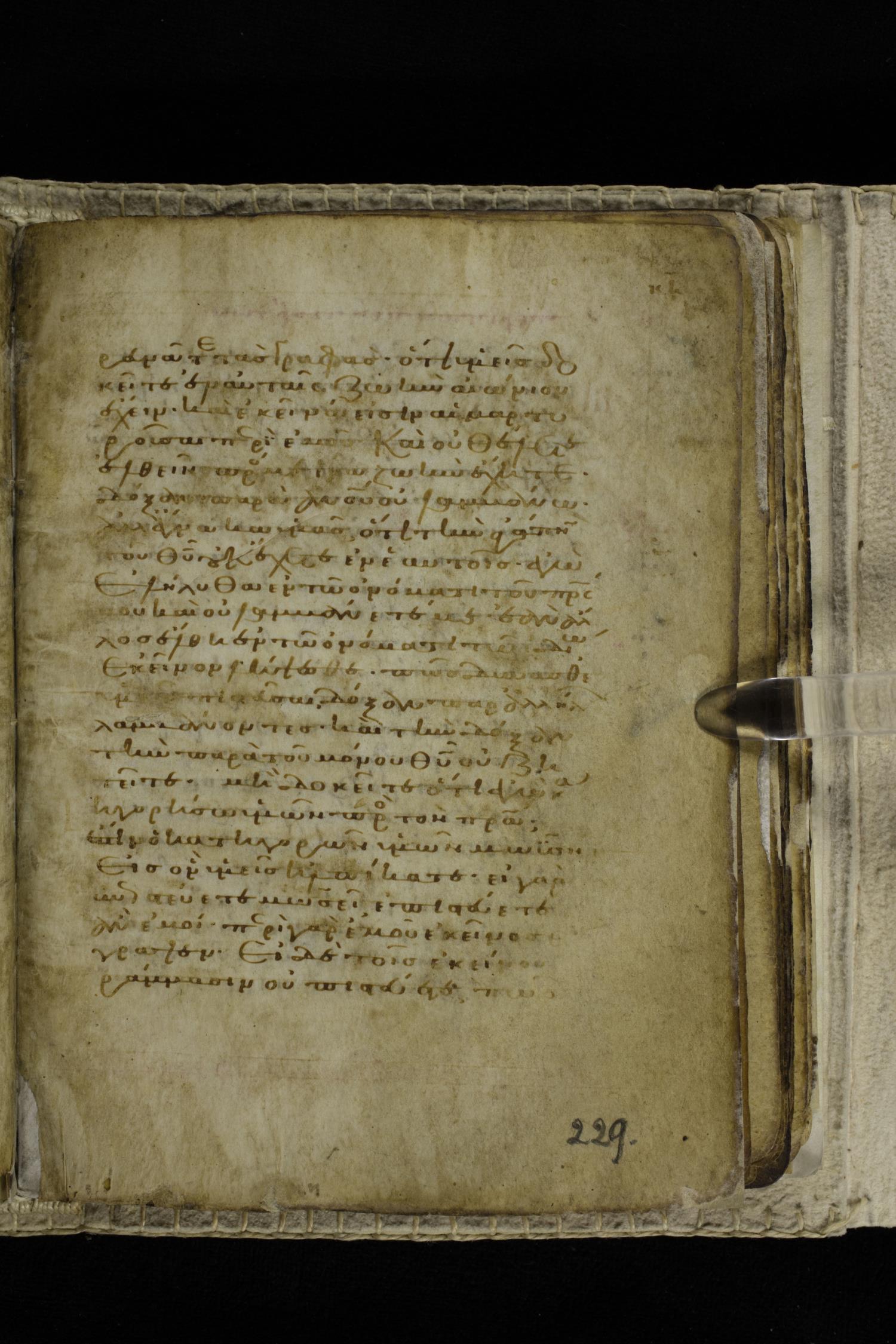 Eleventh century minuscule of the Gospels on parchment; 262 leaves, single column, 22-23 lines per column. Images were taken at the Hellenic Parliament Library in Athens.