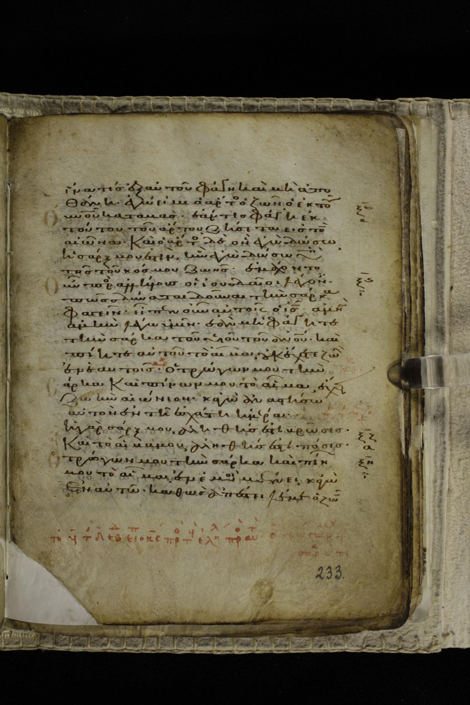 Eleventh century minuscule of the Gospels on parchment; 262 leaves, single column, 22-23 lines per column. Images were taken at the Hellenic Parliament Library in Athens.
