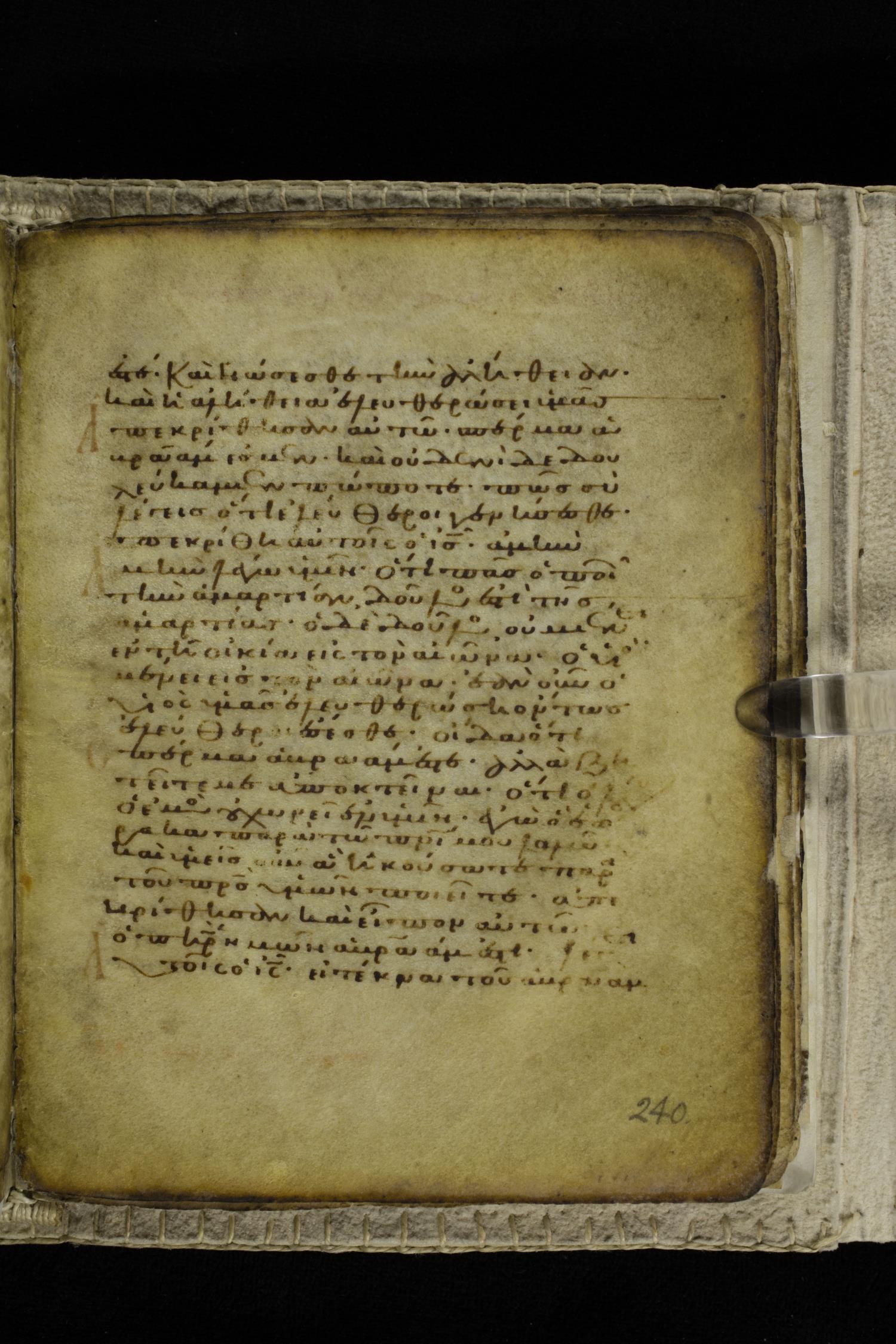 Eleventh century minuscule of the Gospels on parchment; 262 leaves, single column, 22-23 lines per column. Images were taken at the Hellenic Parliament Library in Athens.
