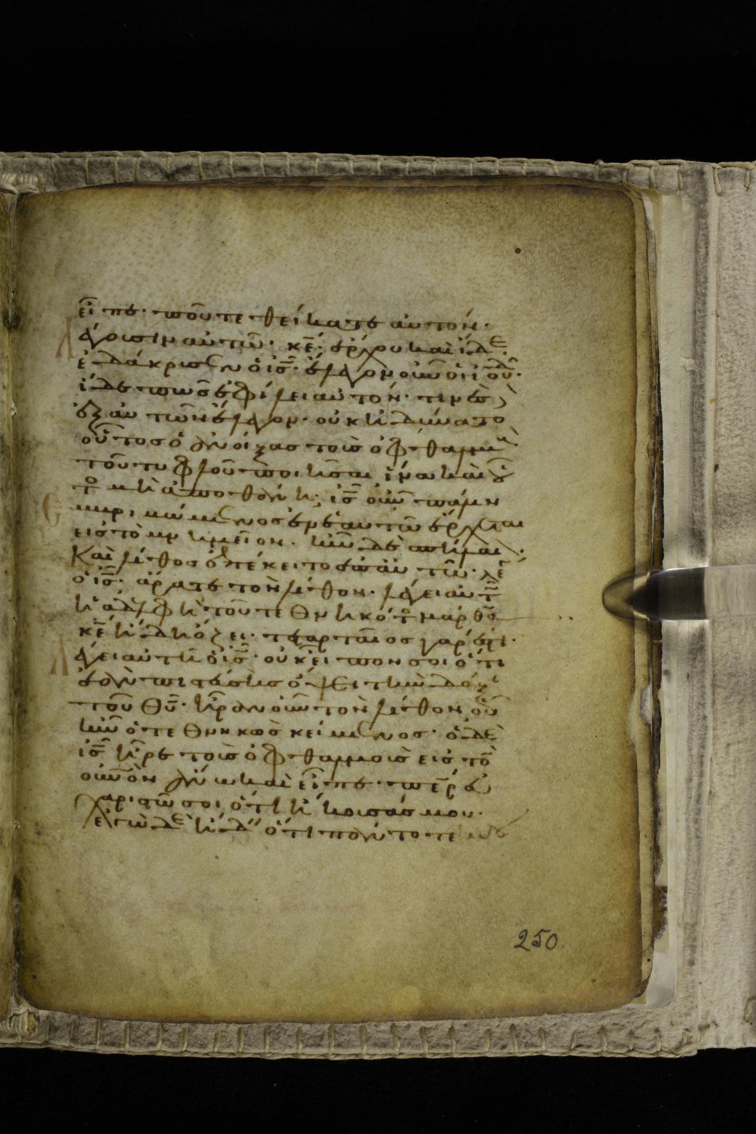 Eleventh century minuscule of the Gospels on parchment; 262 leaves, single column, 22-23 lines per column. Images were taken at the Hellenic Parliament Library in Athens.