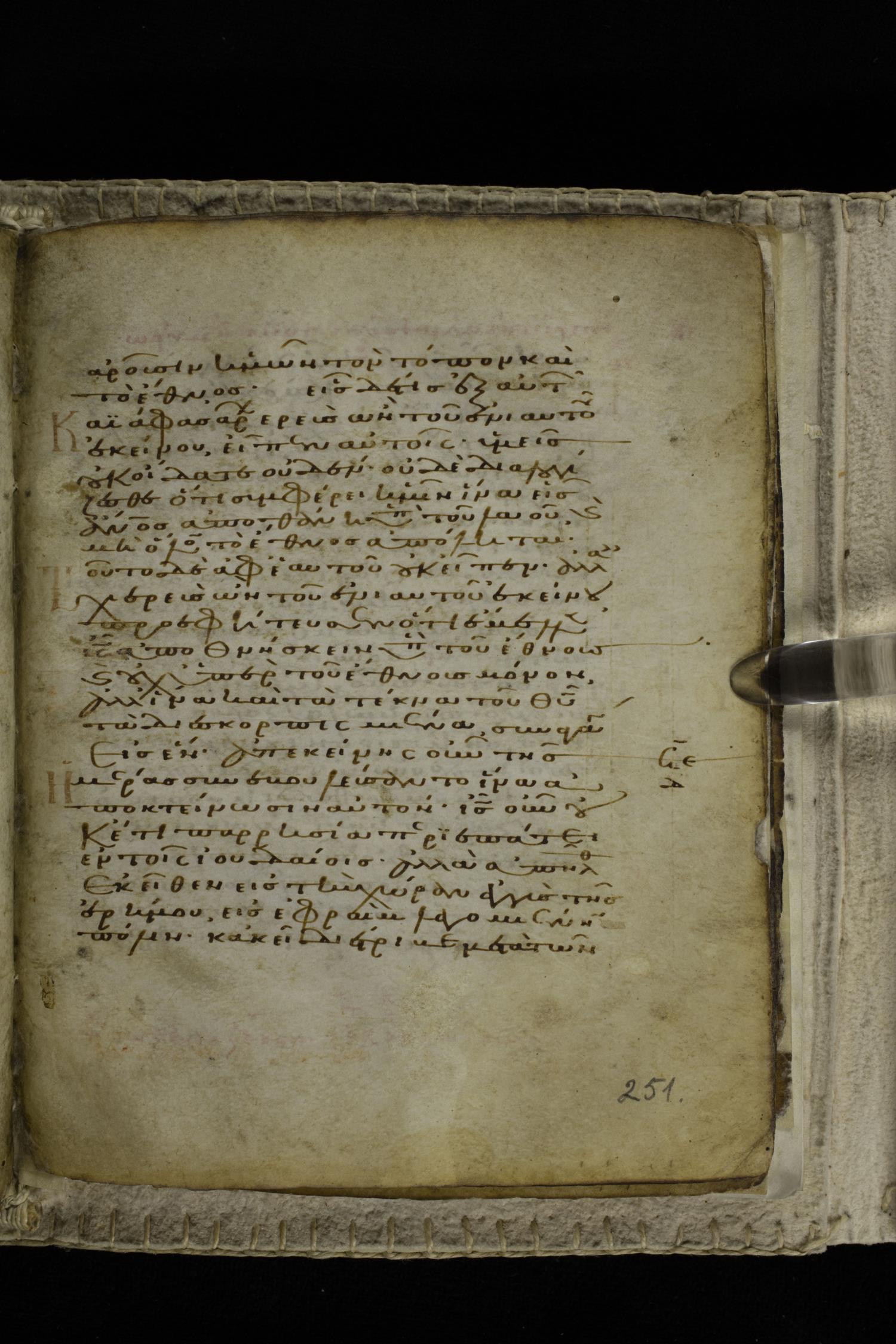 Eleventh century minuscule of the Gospels on parchment; 262 leaves, single column, 22-23 lines per column. Images were taken at the Hellenic Parliament Library in Athens.