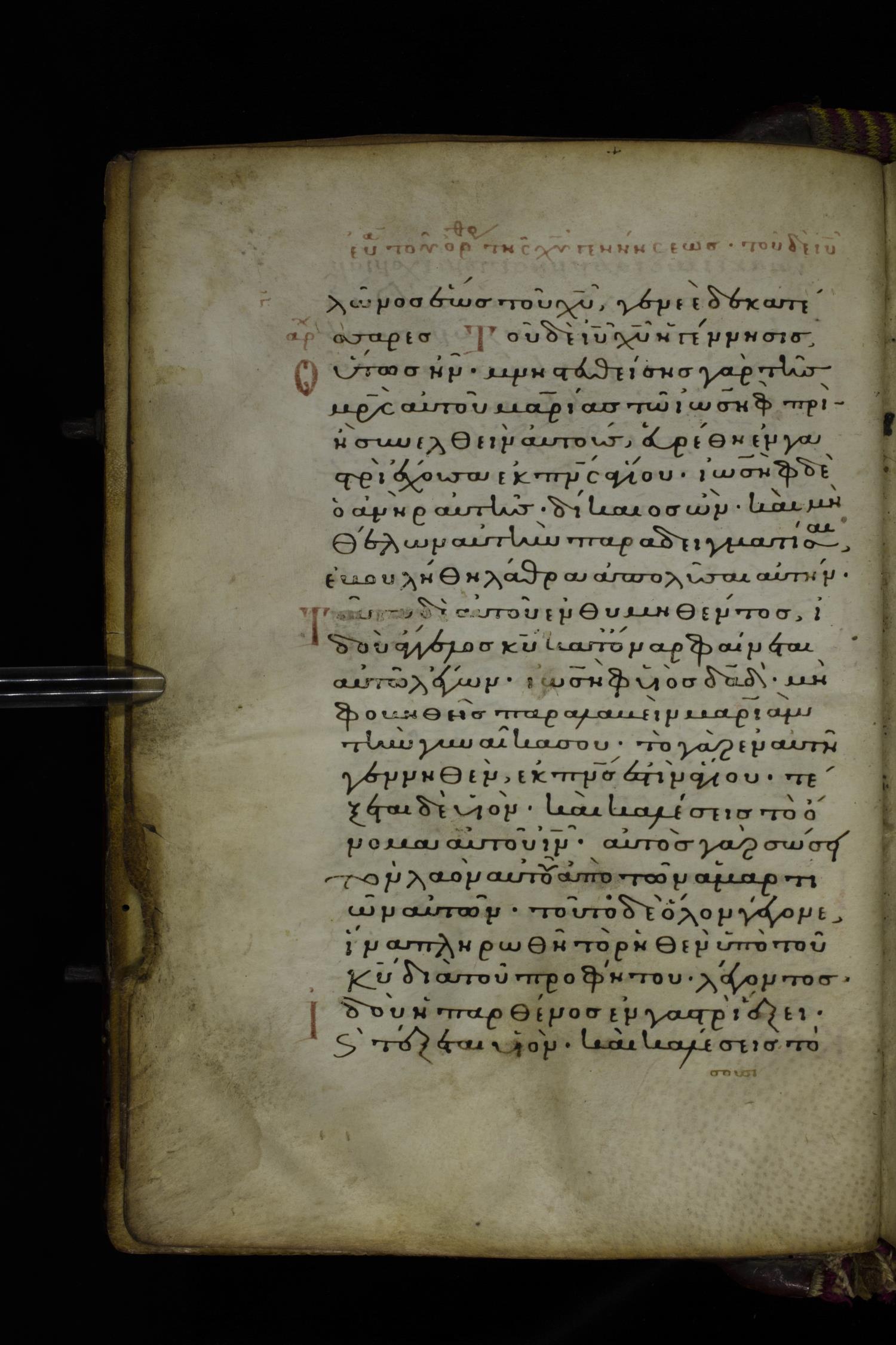 ΤΟΥ ΔΕ ΙΗΣΟΥ ΧΡΙΣΤΟΥ ἡ γένεσις οὕτως ἦν. Μνηστευθείσης τῆς μητρὸς αὐτοῦ Μαρίας τῷ Ἰωσήφ, πρὶν ἢ συνελθεῖν αὐτοὺς εὑρέθη ἐν γαστρὶ ἔχουσα ἐκ πνεύματος ἁγίου.