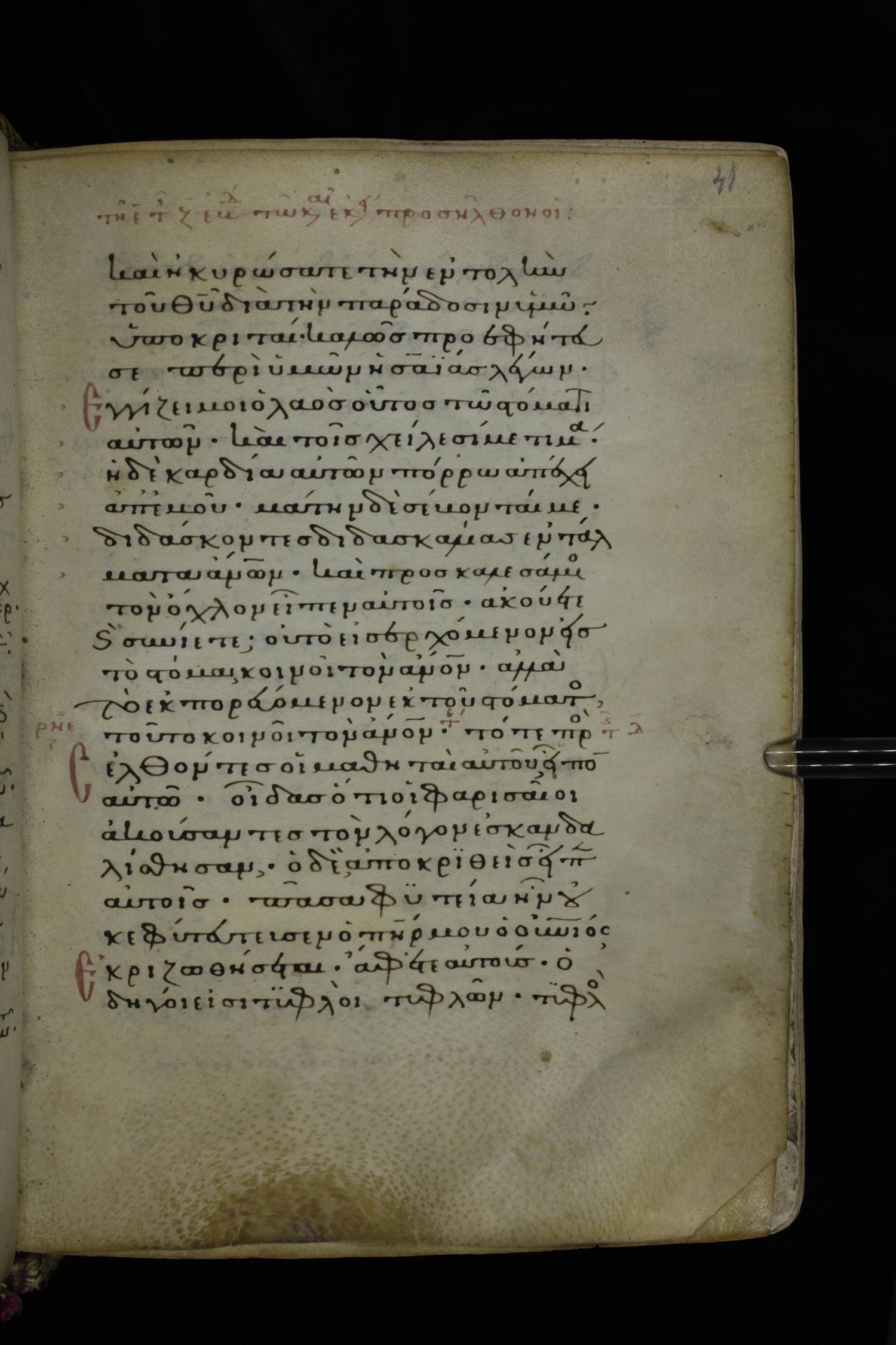 Fourteenth century minuscule (dated to 1321) of the Gospels on parchment; 290 leaves, 1 column, 21-23 lines per column. Images were taken at the National Library of Greece in Athens.