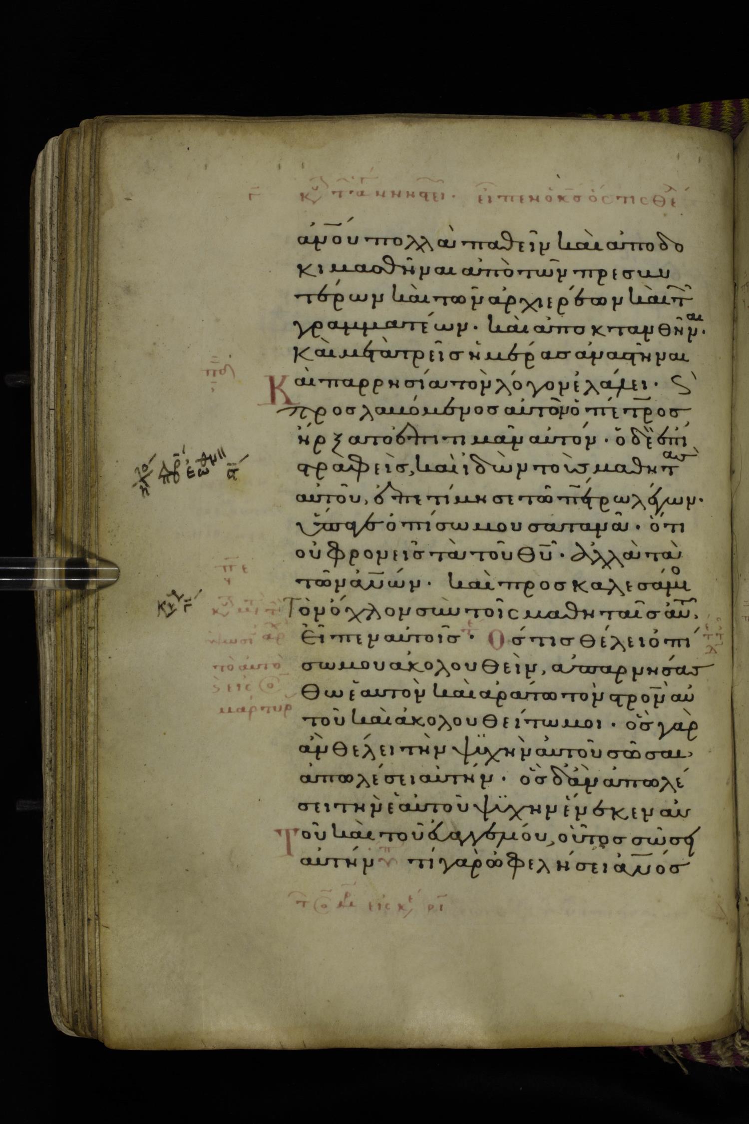 Fourteenth century minuscule (dated to 1321) of the Gospels on parchment; 290 leaves, 1 column, 21-23 lines per column. Images were taken at the National Library of Greece in Athens.