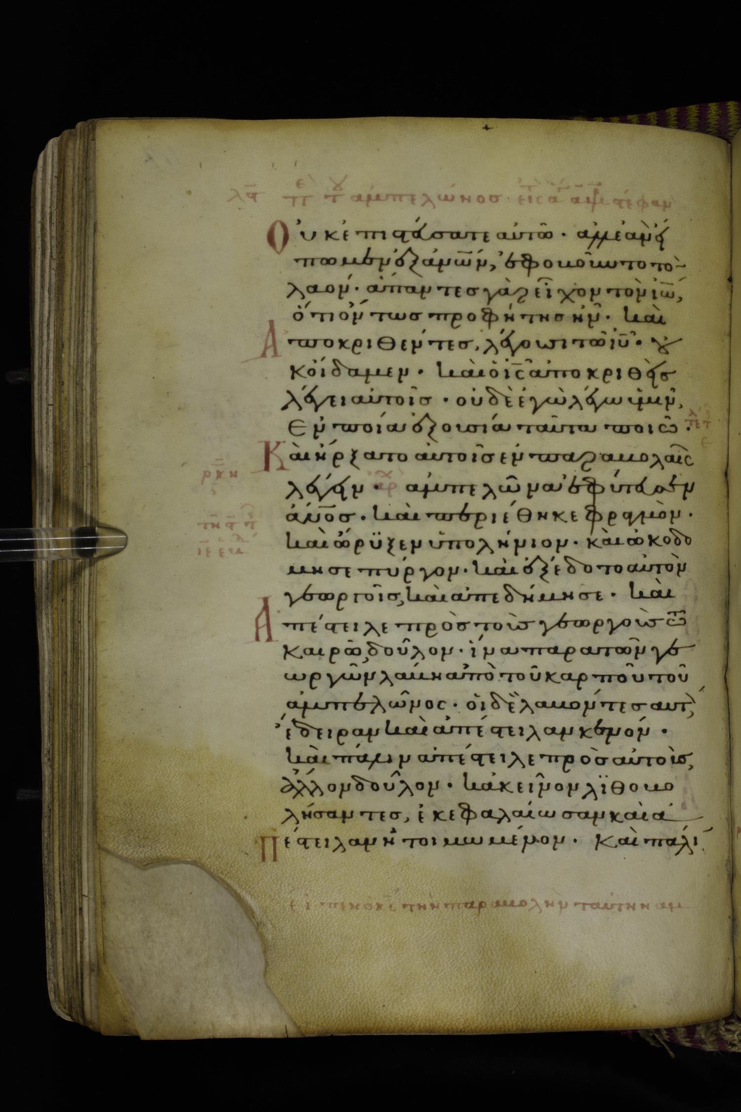 Fourteenth century minuscule (dated to 1321) of the Gospels on parchment; 290 leaves, 1 column, 21-23 lines per column. Images were taken at the National Library of Greece in Athens.