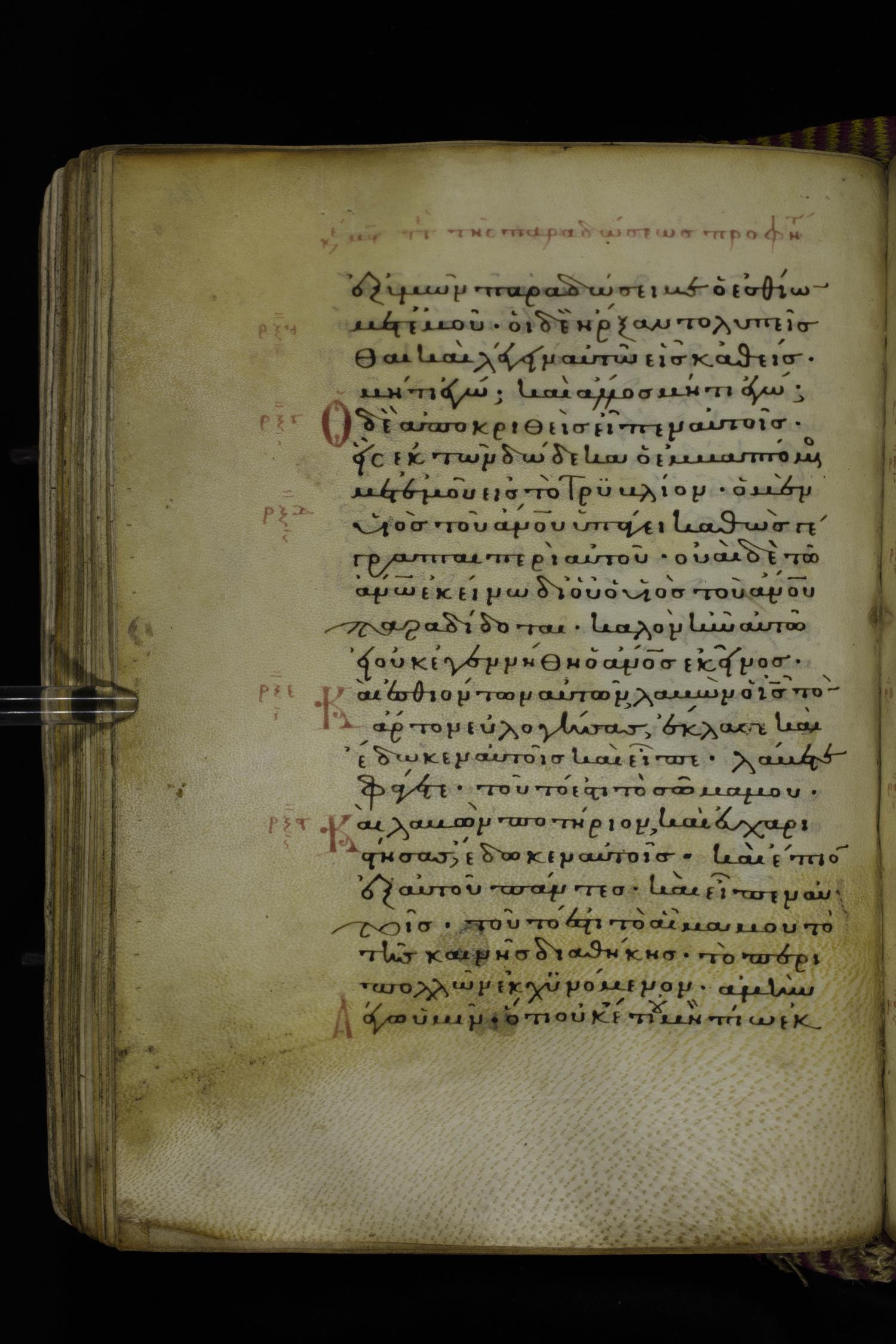 Fourteenth century minuscule (dated to 1321) of the Gospels on parchment; 290 leaves, 1 column, 21-23 lines per column. Images were taken at the National Library of Greece in Athens.