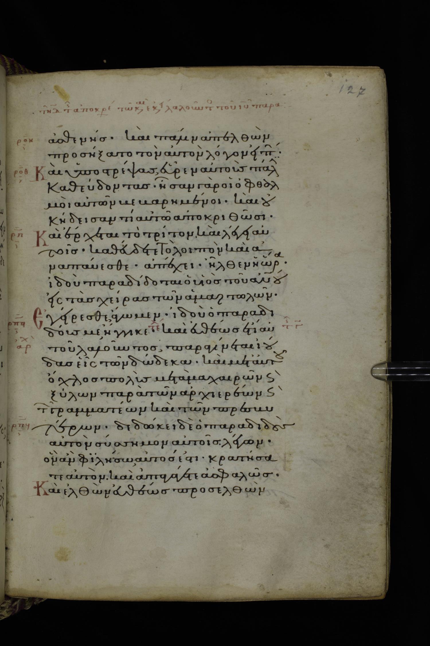 Fourteenth century minuscule (dated to 1321) of the Gospels on parchment; 290 leaves, 1 column, 21-23 lines per column. Images were taken at the National Library of Greece in Athens.