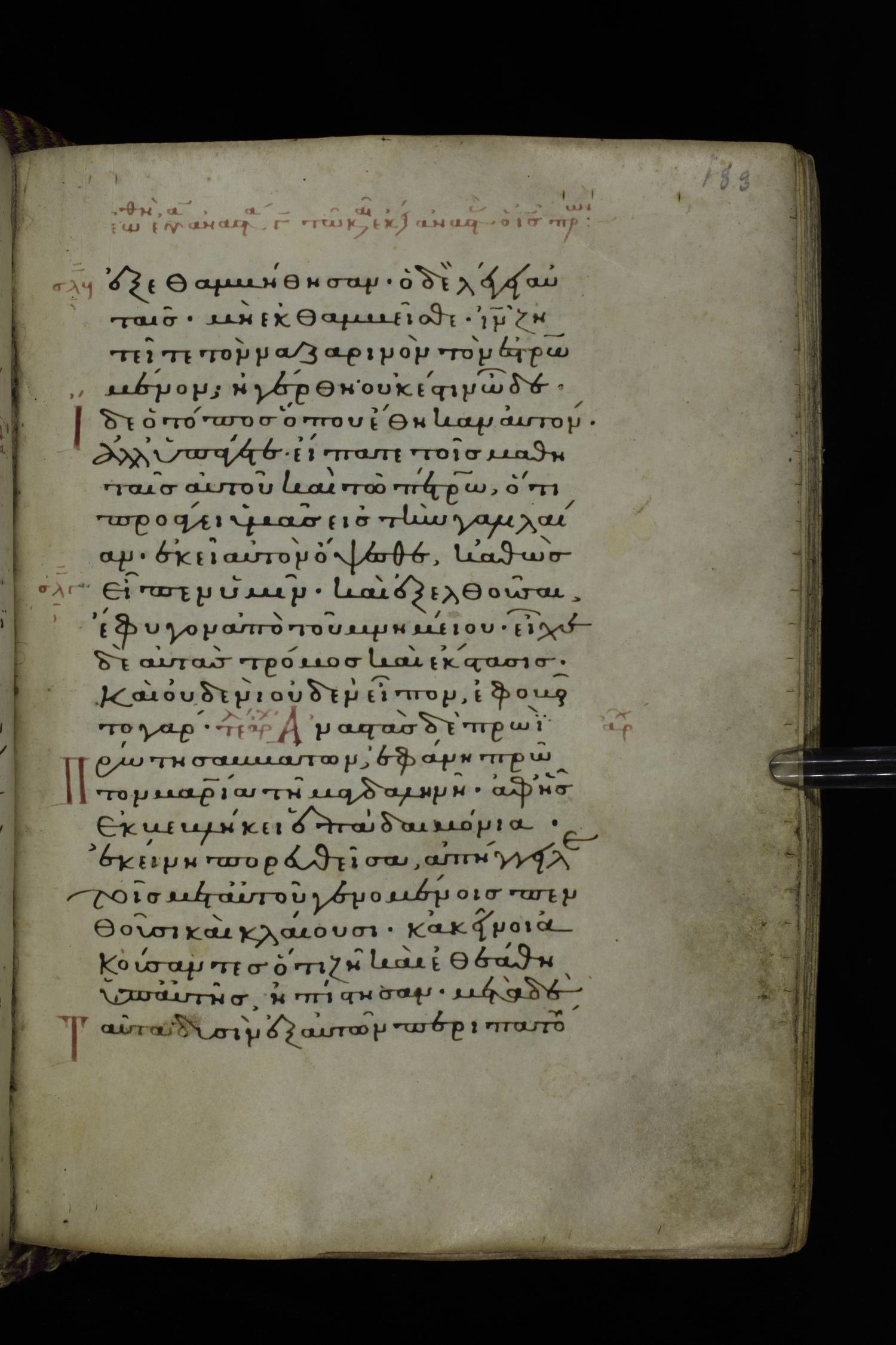 Fourteenth century minuscule (dated to 1321) of the Gospels on parchment; 290 leaves, 1 column, 21-23 lines per column. Images were taken at the National Library of Greece in Athens.