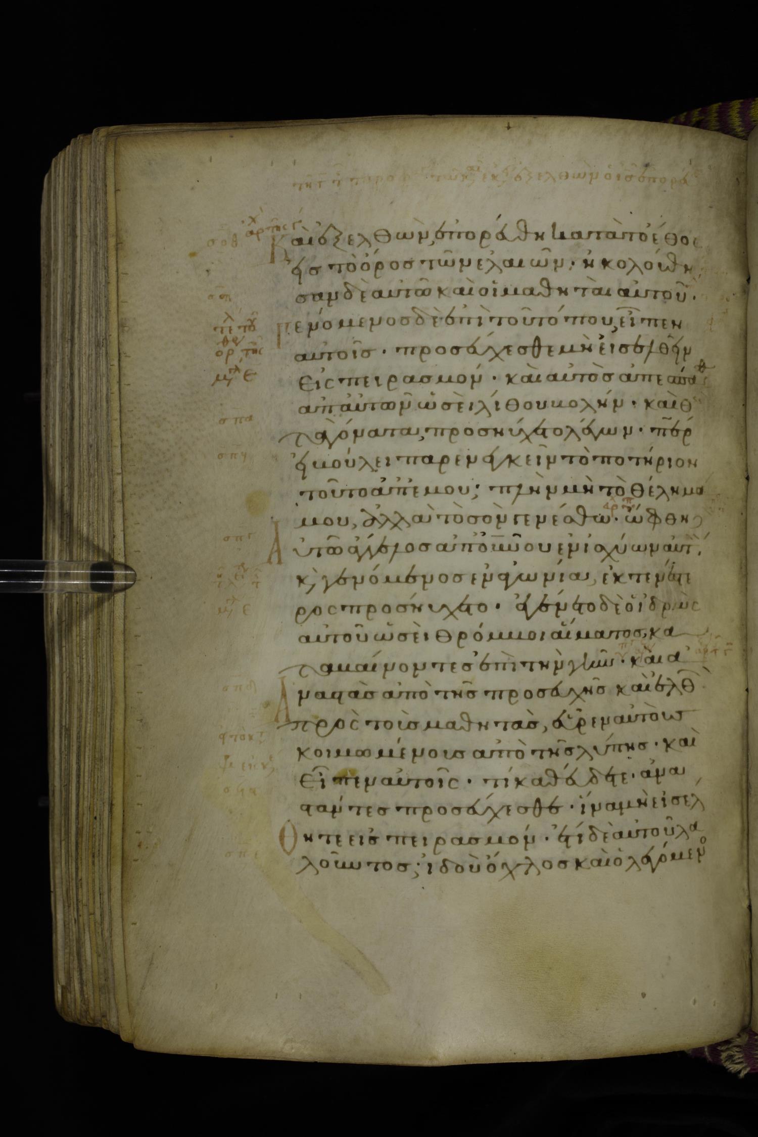 Fourteenth century minuscule (dated to 1321) of the Gospels on parchment; 290 leaves, 1 column, 21-23 lines per column. Images were taken at the National Library of Greece in Athens.