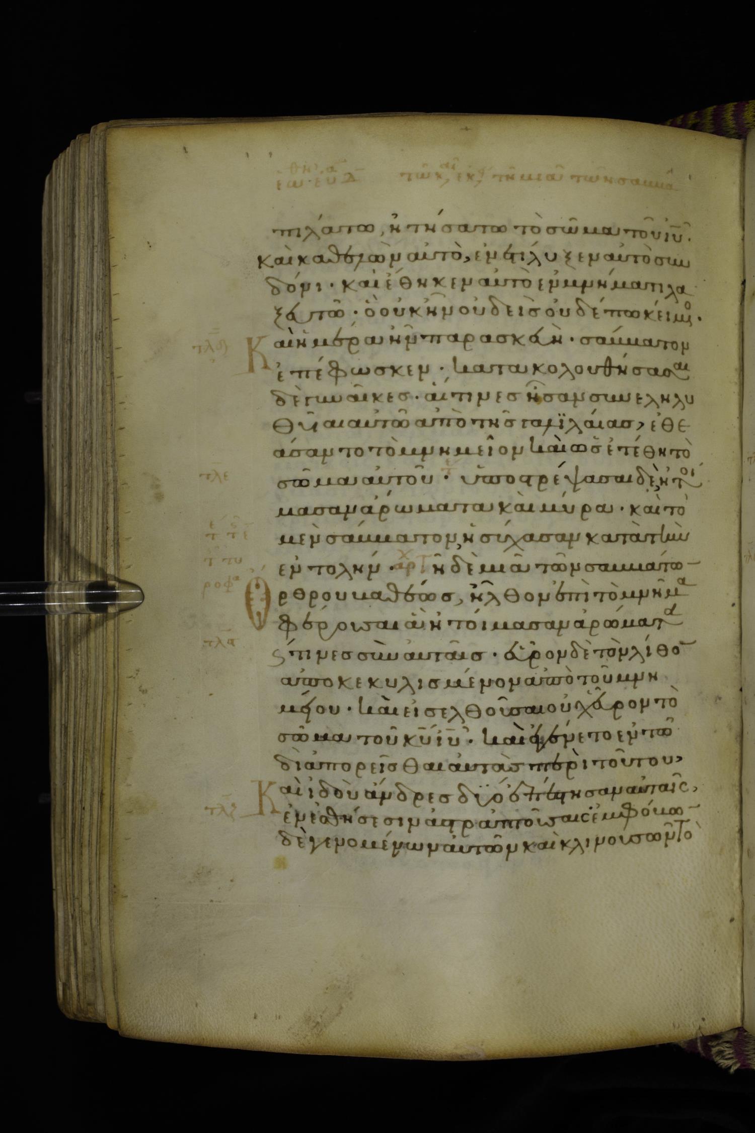 Fourteenth century minuscule (dated to 1321) of the Gospels on parchment; 290 leaves, 1 column, 21-23 lines per column. Images were taken at the National Library of Greece in Athens.
