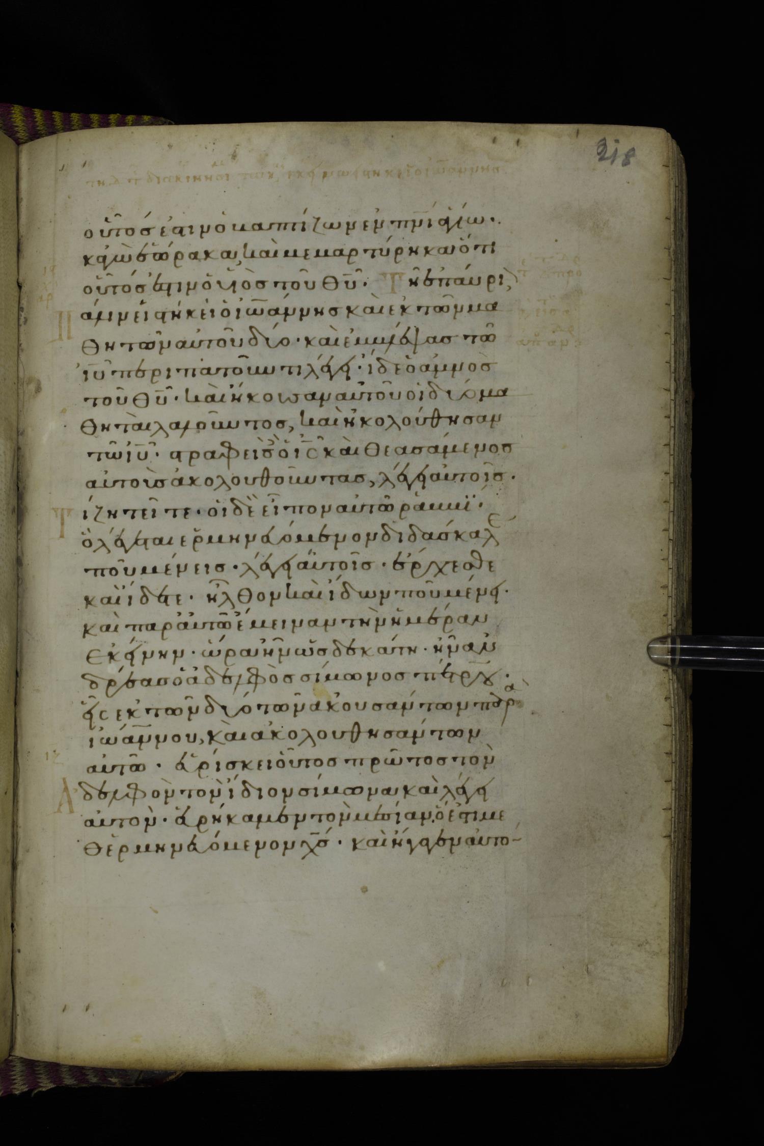Fourteenth century minuscule (dated to 1321) of the Gospels on parchment; 290 leaves, 1 column, 21-23 lines per column. Images were taken at the National Library of Greece in Athens.