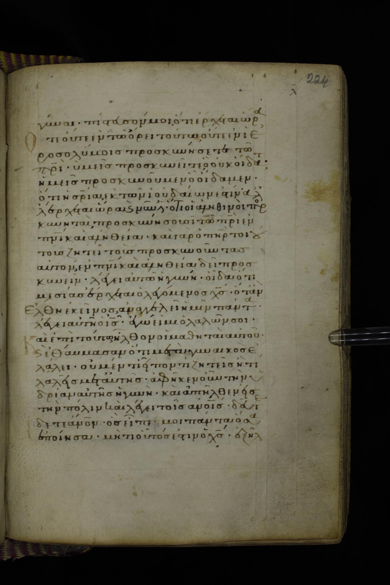 Fourteenth century minuscule (dated to 1321) of the Gospels on parchment; 290 leaves, 1 column, 21-23 lines per column. Images were taken at the National Library of Greece in Athens.