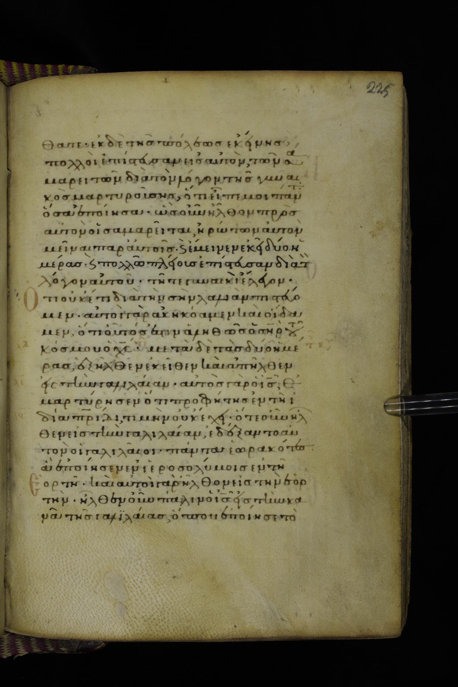 Fourteenth century minuscule (dated to 1321) of the Gospels on parchment; 290 leaves, 1 column, 21-23 lines per column. Images were taken at the National Library of Greece in Athens.