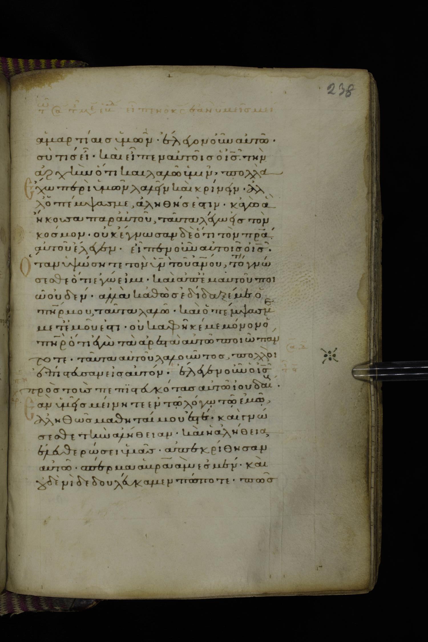 Fourteenth century minuscule (dated to 1321) of the Gospels on parchment; 290 leaves, 1 column, 21-23 lines per column. Images were taken at the National Library of Greece in Athens.