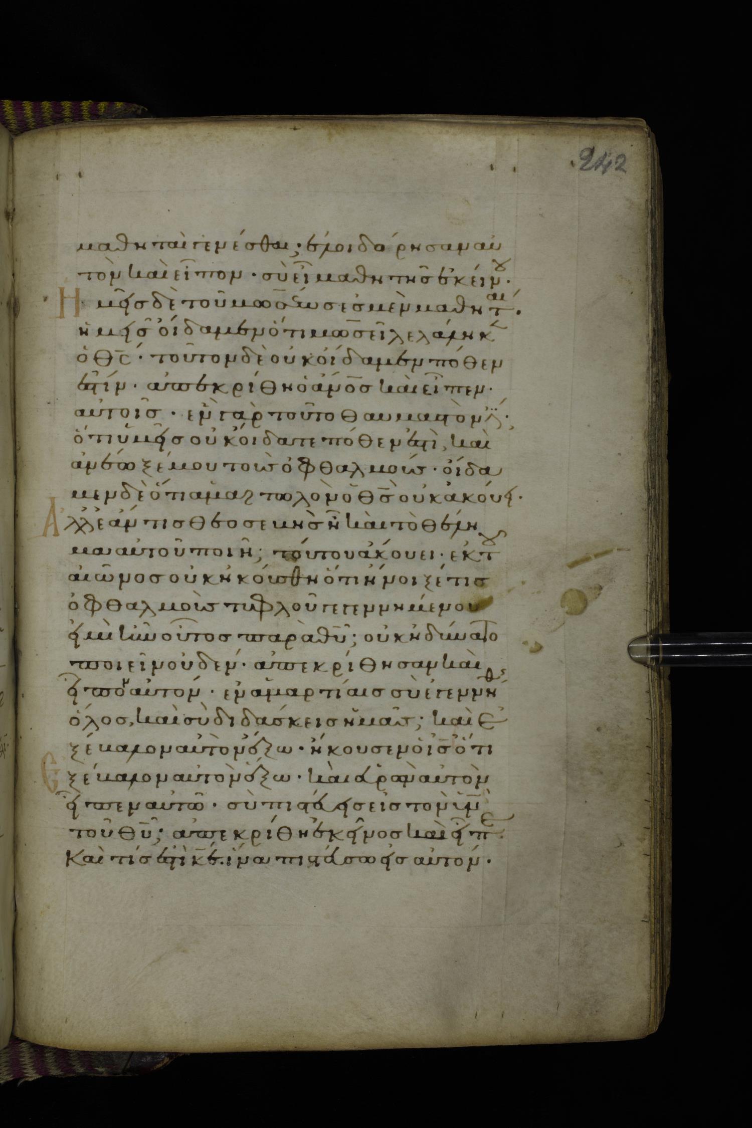 Fourteenth century minuscule (dated to 1321) of the Gospels on parchment; 290 leaves, 1 column, 21-23 lines per column. Images were taken at the National Library of Greece in Athens.