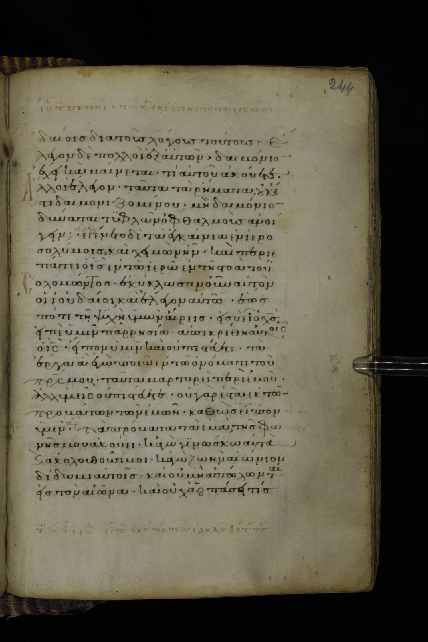 Fourteenth century minuscule (dated to 1321) of the Gospels on parchment; 290 leaves, 1 column, 21-23 lines per column. Images were taken at the National Library of Greece in Athens.