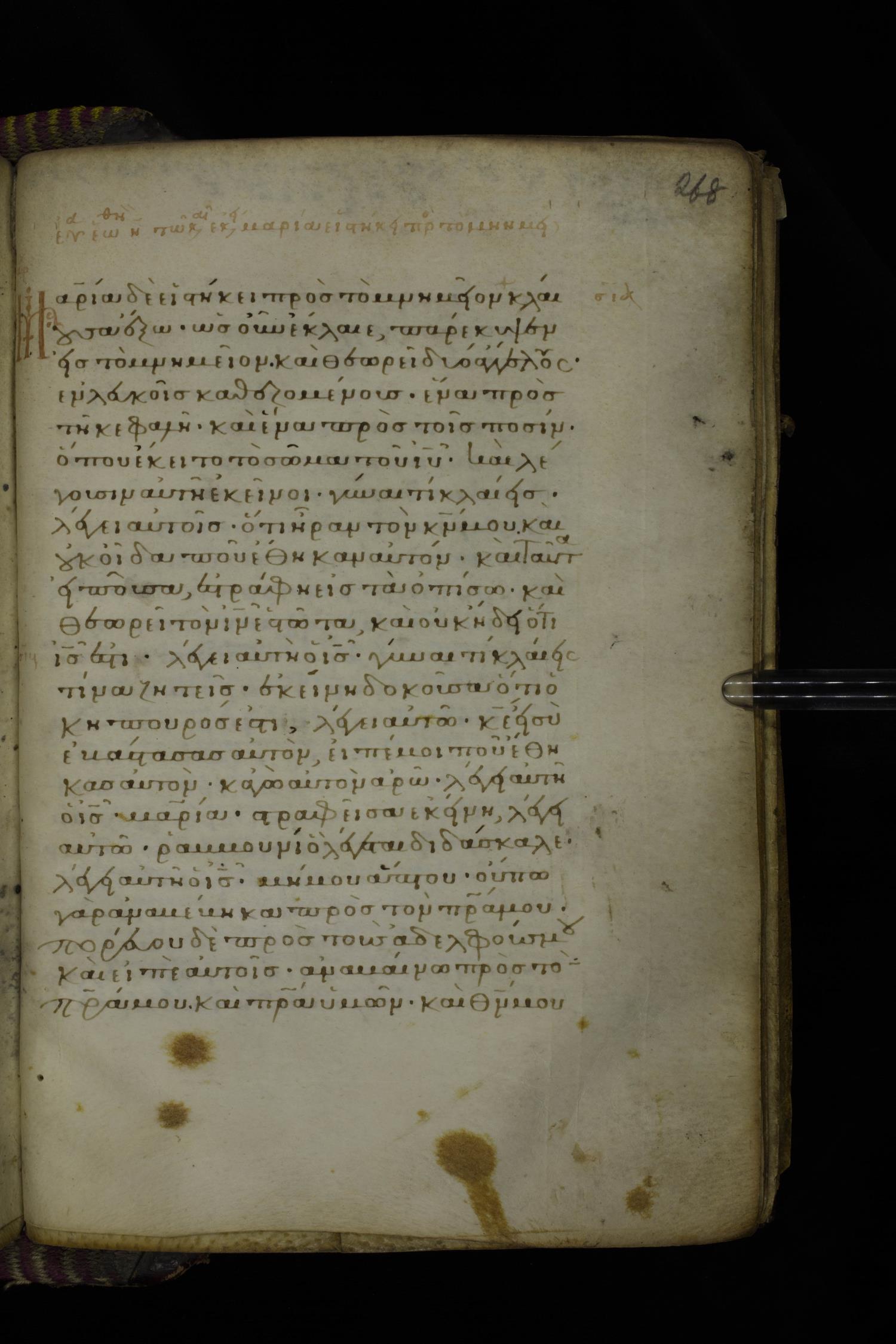 Fourteenth century minuscule (dated to 1321) of the Gospels on parchment; 290 leaves, 1 column, 21-23 lines per column. Images were taken at the National Library of Greece in Athens.