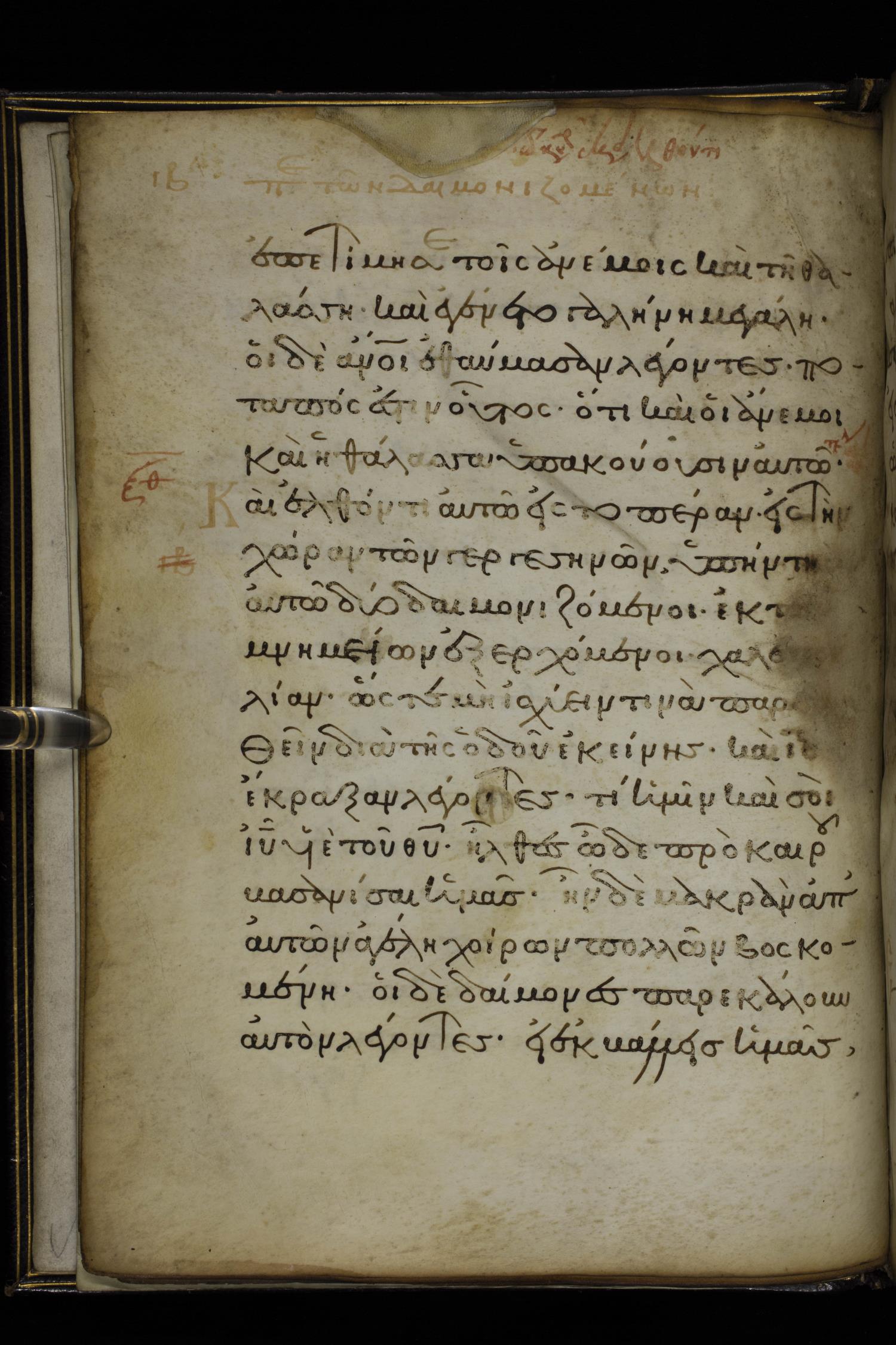 Καὶ ἐλθόντος αὐτοῦ εἰς τὸ πέραν εἰς τὴν χώραν τῶν Γαδαρηνῶν ὑπήντησαν αὐτῷ δύο δαιμονιζόμενοι ἐκ τῶν μνημείων ἐξερχόμενοι, χαλεποὶ λίαν ὥστε μὴ ἰσχύειν τινὰ παρελθεῖν διὰ τῆς ὁδοῦ ἐκείνης.