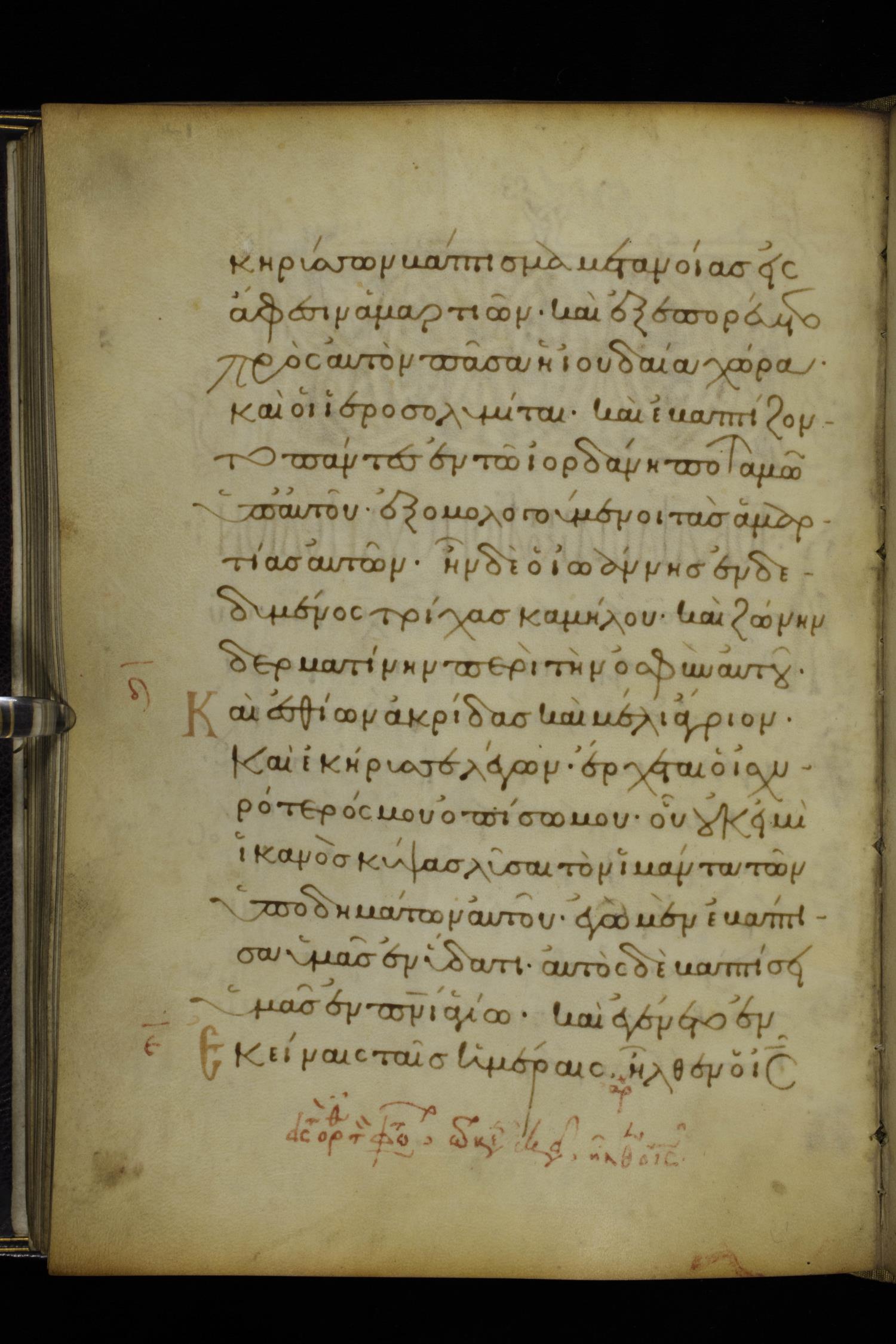 καὶ ἦν ὁ Ἰωάνης / Ἰωάννης ἐνδεδυμένος τρίχας καμήλου καὶ ζώνην δερματίνην περὶ τὴν ὀσφὺν αὐτοῦ, καὶ ἔσθων / ἐσθίων ἀκρίδας καὶ μέλι ἄγριον.