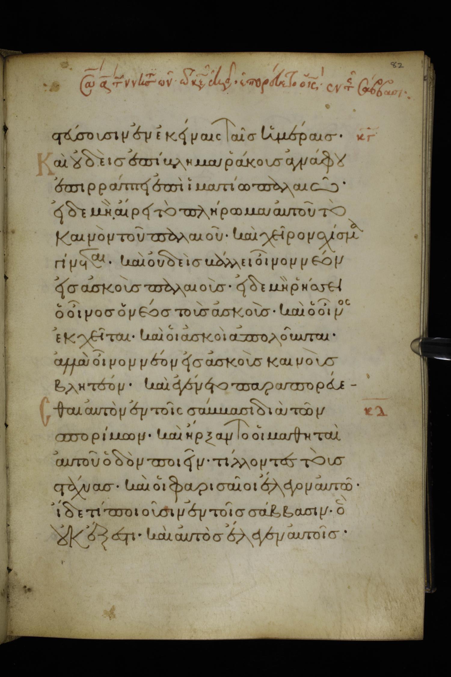 καὶ οὐδεὶς βάλλει οἶνον νέον εἰς ἀσκοὺς παλαιούς· εἰ δὲ μή, ῥήξει ὁ οἶνος τοὺς ἀσκούς, καὶ ὁ οἶνος ἀπόλλυται καὶ οἱ ἀσκοί. ἀλλὰ οἶνον νέον εἰς ἀσκοὺς καινούς