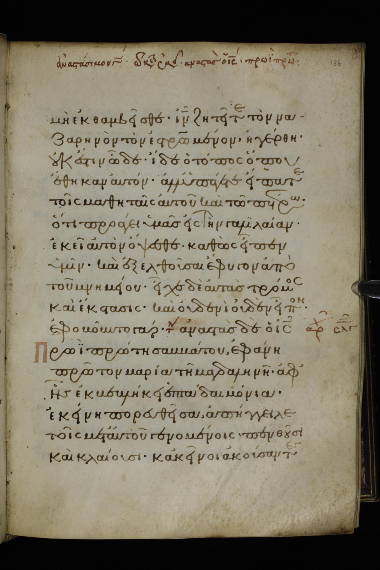 Ἀναστὰς δὲ πρωὶ πρώτῃ σαββάτου ἐφάνη πρῶτον Μαρίᾳ τῇ Μαγδαληνῇ, παρ´ ἧς ἐκβεβλήκει ἑπτὰ δαιμόνια.