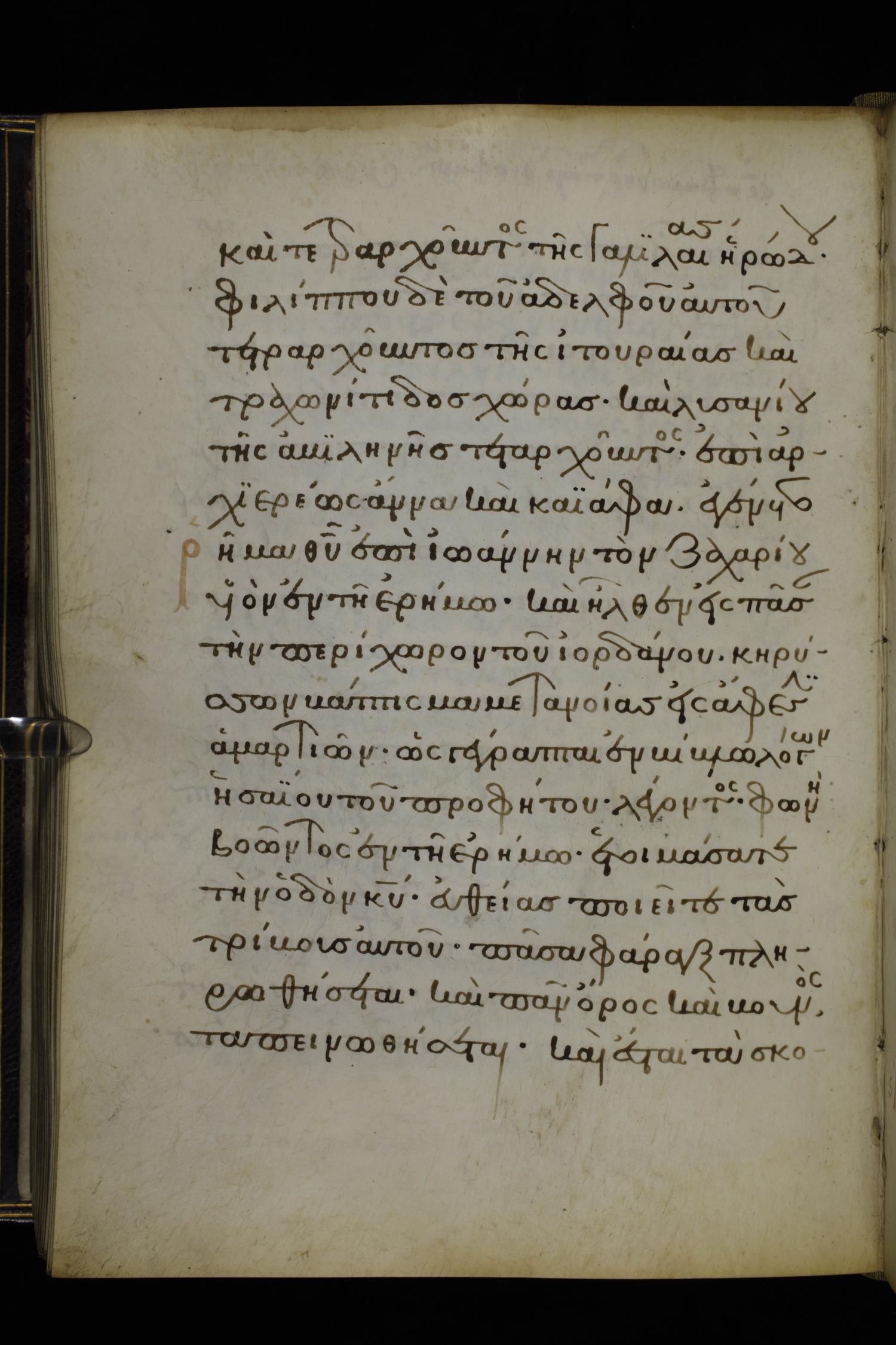 ΕΝ ΕΤΕΙ δὲ πεντεκαιδεκάτῳ τῆς ἡγεμονίας Τιβερίου Καίσαρος, ἡγεμονεύοντος Ποντίου Πειλάτου / Πιλάτου τῆς Ἰουδαίας, καὶ τετρααρχοῦντος τῆς Γαλιλαίας Ἡρῴδου, Φιλίππου δὲ τοῦ ἀδελφοῦ αὐτοῦ τετρααρχοῦντος τῆς Ἰτουραίας καὶ Τραχωνίτιδος χώρας, καὶ Λυσανίου τῆς Ἀβειληνῆς / Ἀβιληνῆς τετρααρχοῦντος,