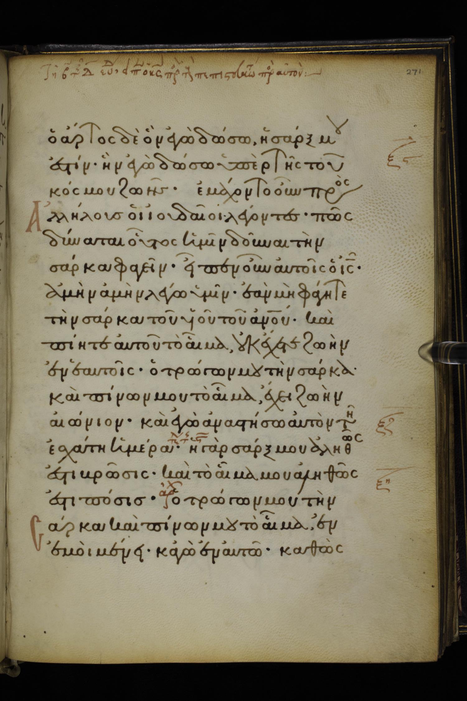 ὁ τρώγων μου τὴν σάρκα καὶ πίνων μου τὸ αἷμα ἐν ἐμοὶ μένει κἀγὼ ἐν αὐτῷ.