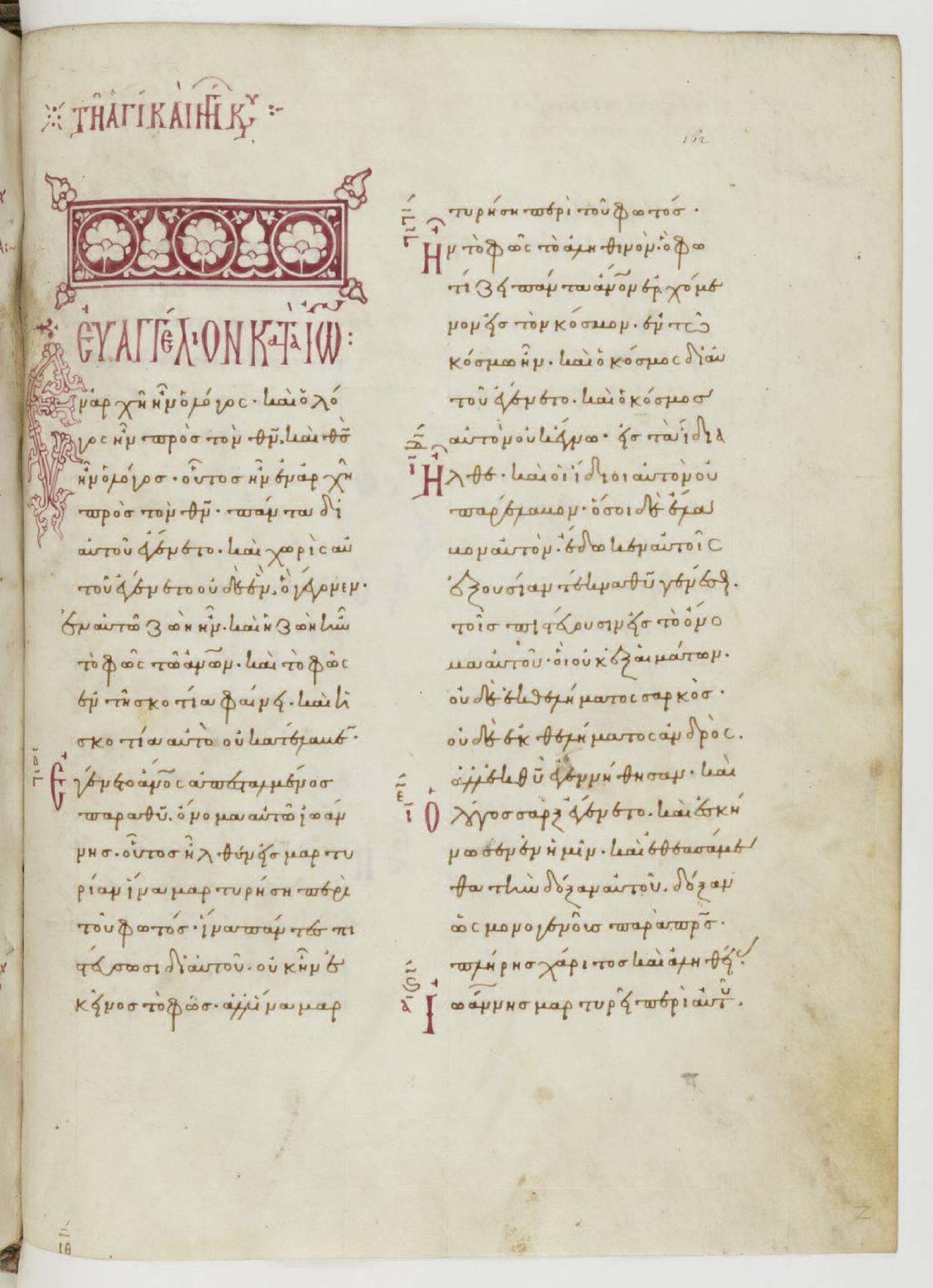 Eleventh century minuscule of the Gospels on parchment; 199 leaves, 2 columns, 22 lines per column. For recent images, please visit the Bibliothèque Nationale.