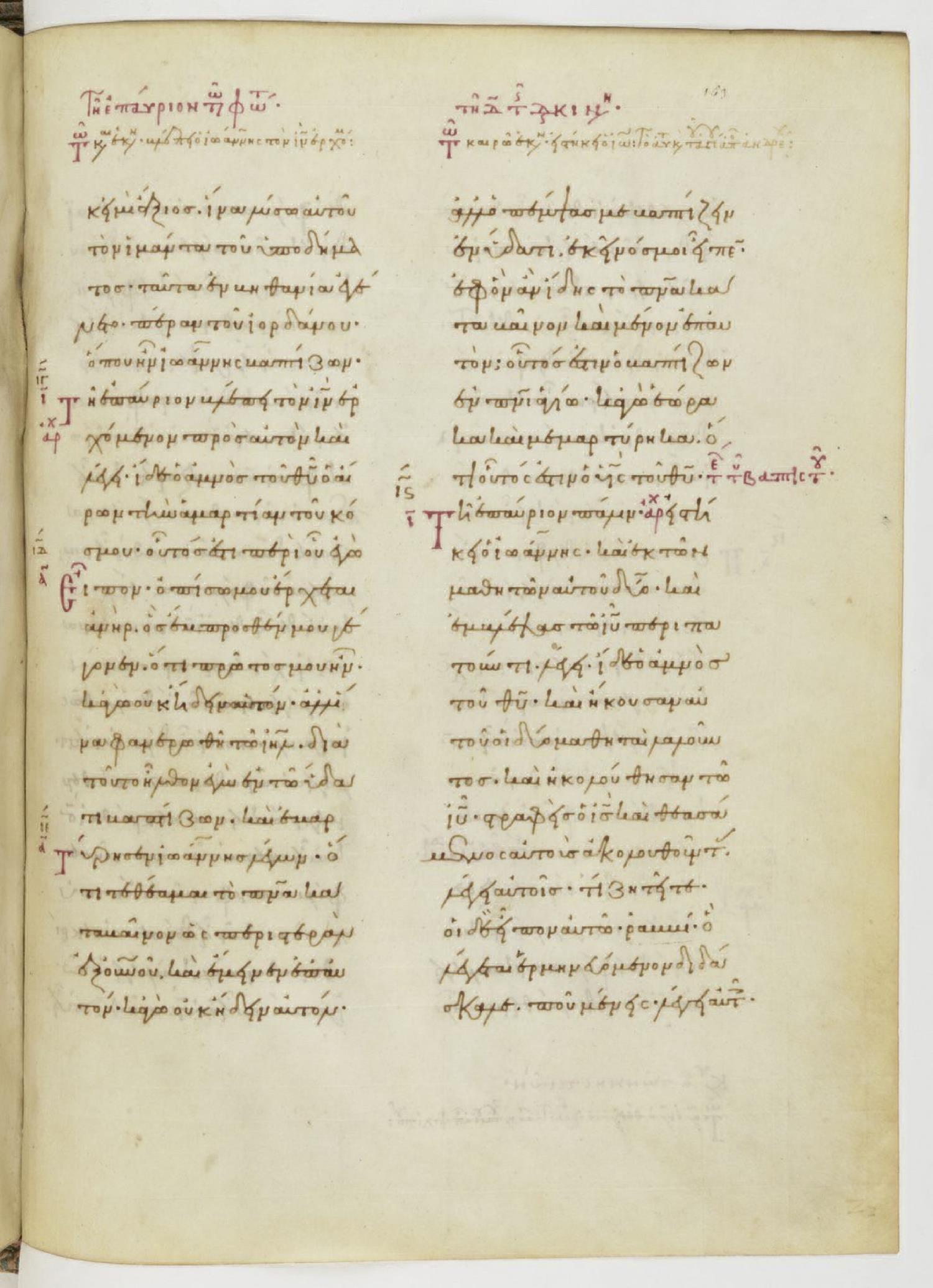 Eleventh century minuscule of the Gospels on parchment; 199 leaves, 2 columns, 22 lines per column. For recent images, please visit the Bibliothèque Nationale.