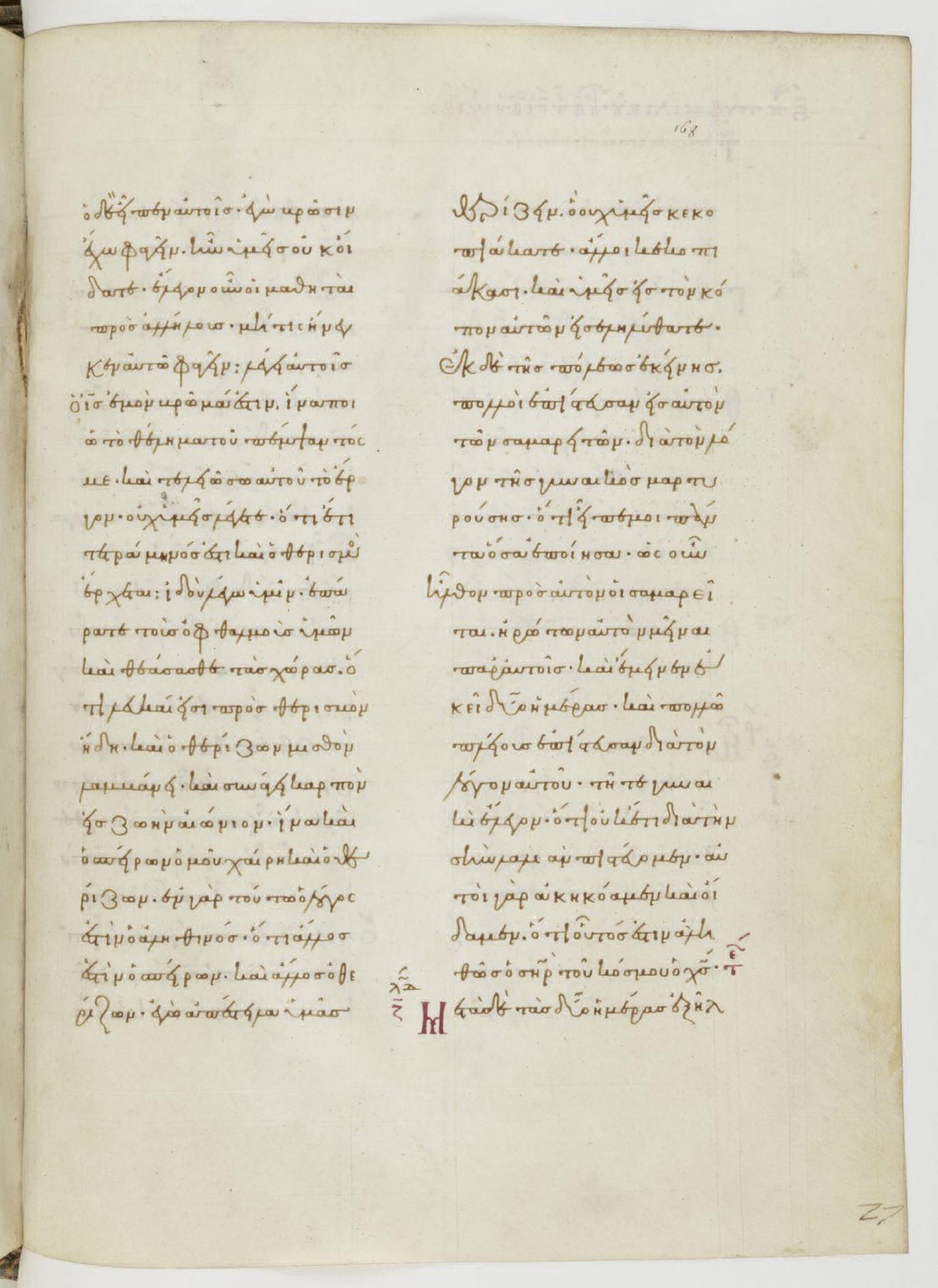 Eleventh century minuscule of the Gospels on parchment; 199 leaves, 2 columns, 22 lines per column. For recent images, please visit the Bibliothèque Nationale.