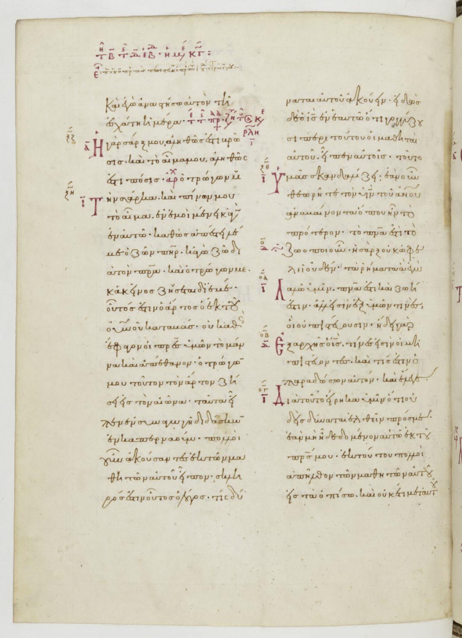 Eleventh century minuscule of the Gospels on parchment; 199 leaves, 2 columns, 22 lines per column. For recent images, please visit the Bibliothèque Nationale.