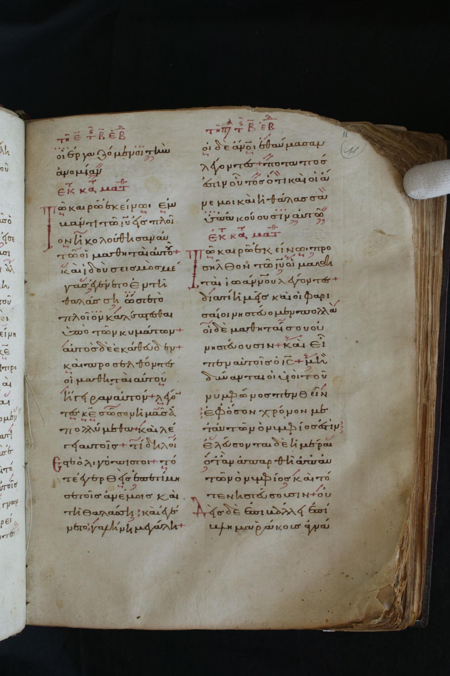 Gospels lectionary manuscript on parchment; 151 leaves, 2 columns, 22–25 lines per column. By agreement with the Albanian National Archives, only a portion of the manuscript is posted.