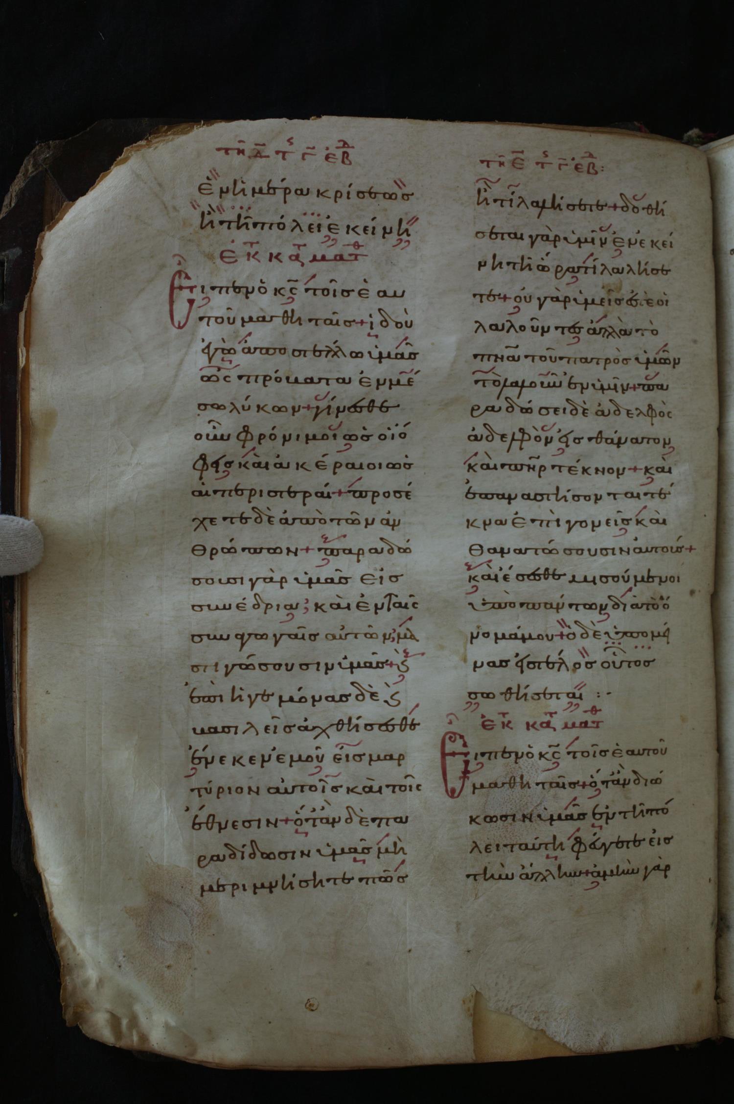 Gospels lectionary manuscript on parchment; 151 leaves, 2 columns, 22–25 lines per column. By agreement with the Albanian National Archives, only a portion of the manuscript is posted.