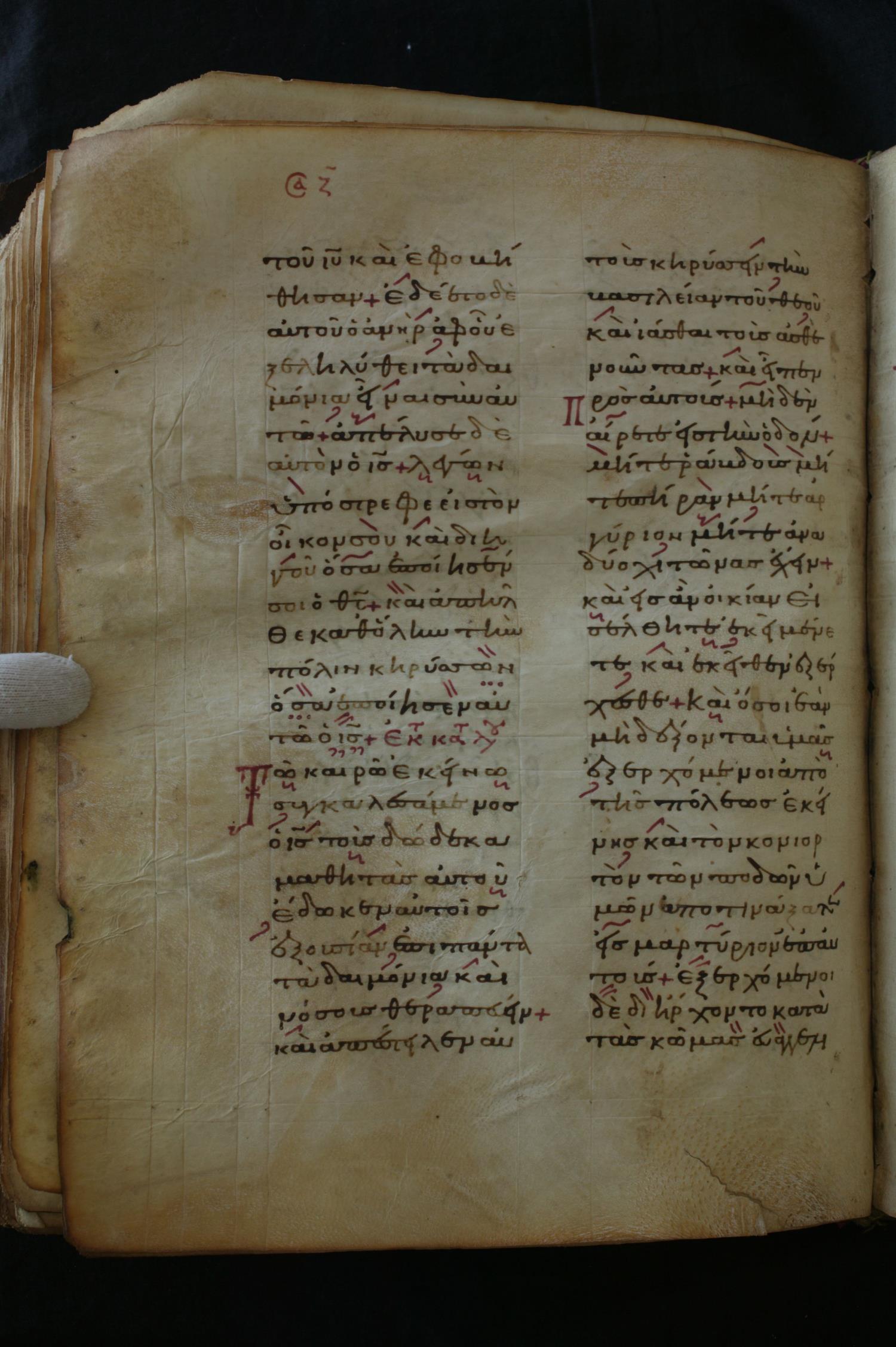 Gospels lectionary manuscript on parchment; 151 leaves, 2 columns, 22–25 lines per column. By agreement with the Albanian National Archives, only a portion of the manuscript is posted.
