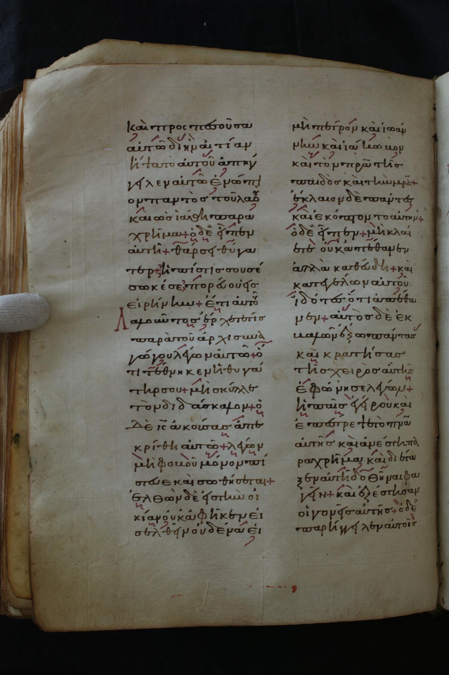 Gospels lectionary manuscript on parchment; 151 leaves, 2 columns, 22–25 lines per column. By agreement with the Albanian National Archives, only a portion of the manuscript is posted.