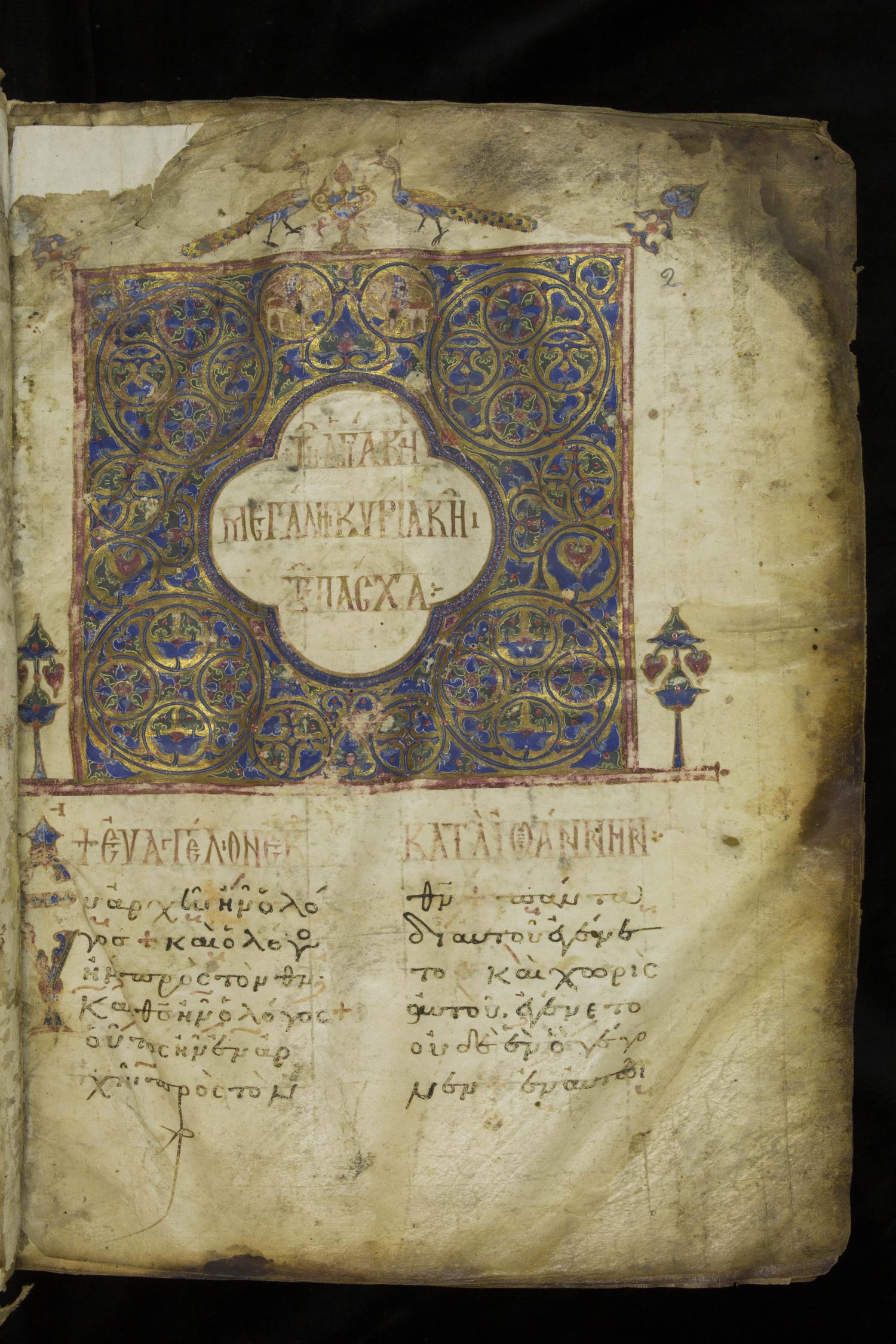 Eleventh century lectionary of the Gospels on parchment; 370 leaves, 2 columns, 23-24 lines per column. Images were taken at the National Library of Greece in Athens.