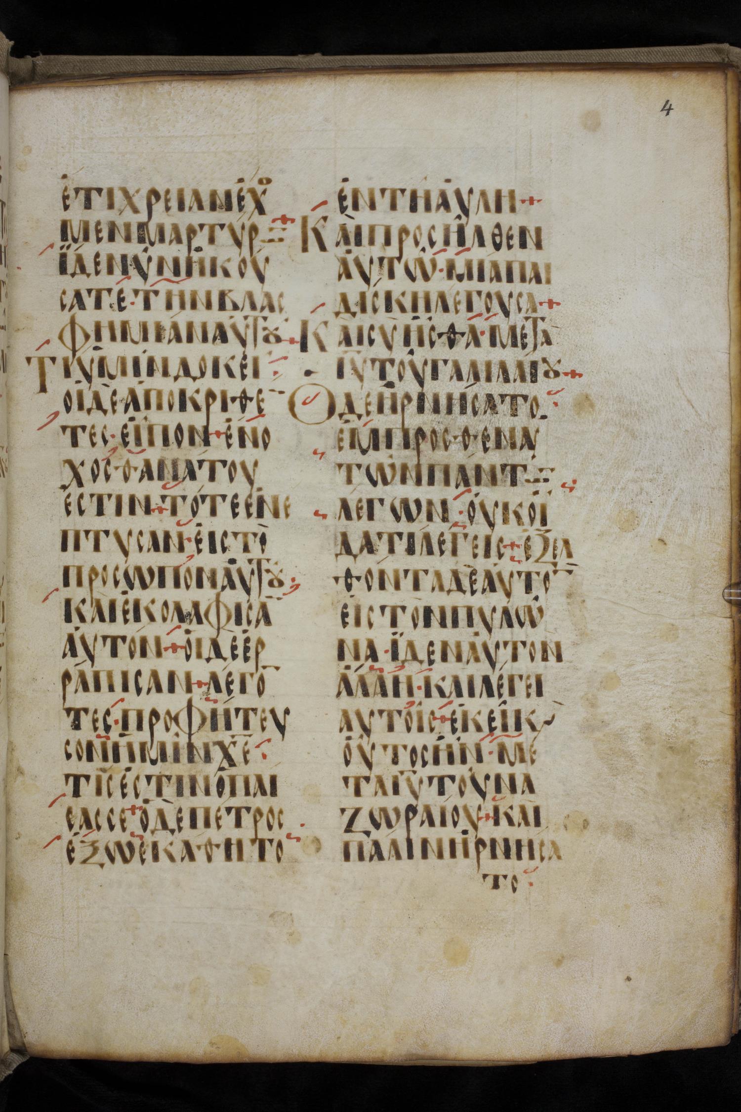 Ninth century majuscule lectionary on parchment; 88 leaves, 2 columns, 20 lines per column. Images were taken at the National Library of Greece in Athens.