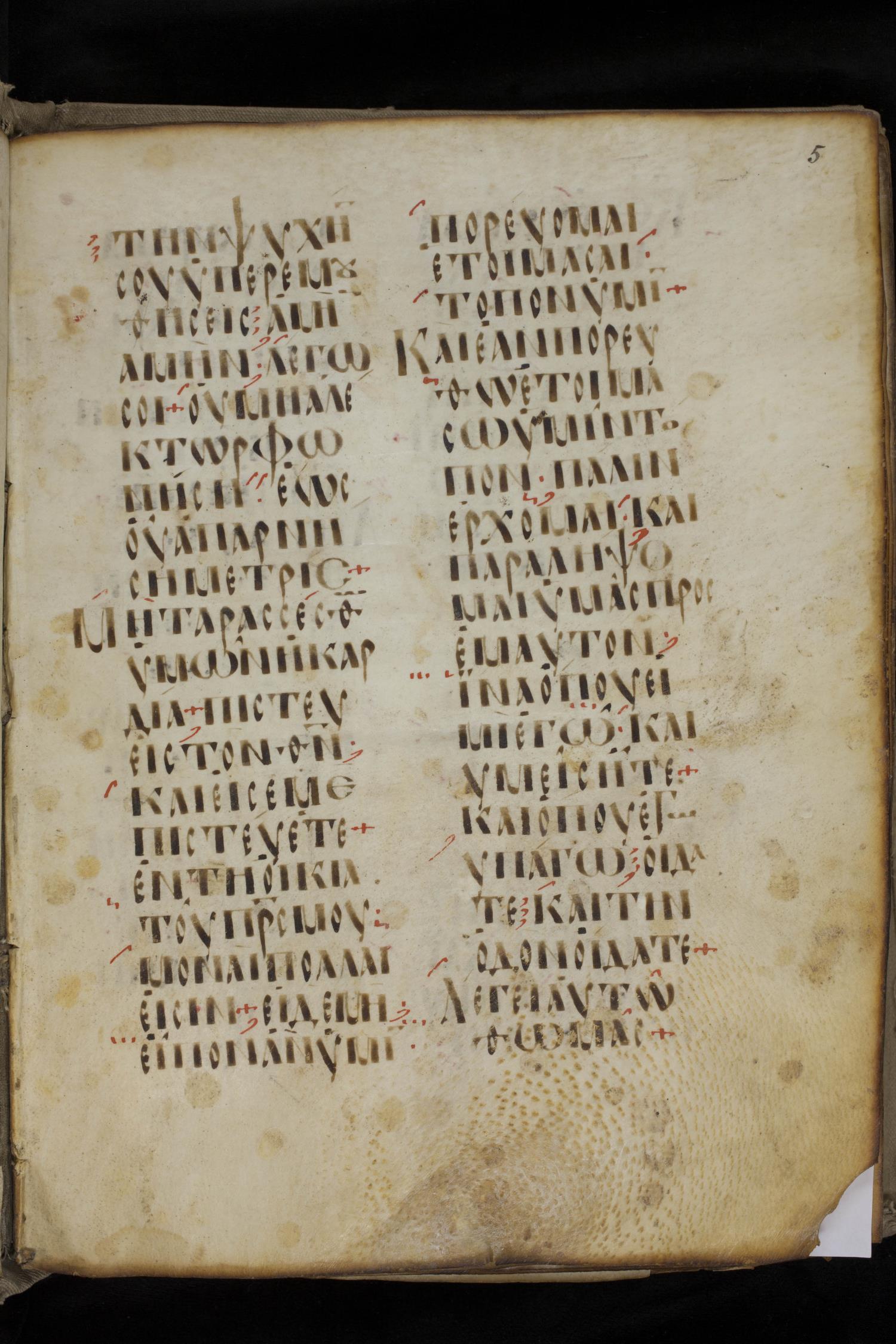 Ninth century majuscule lectionary on parchment; 88 leaves, 2 columns, 20 lines per column. Images were taken at the National Library of Greece in Athens.