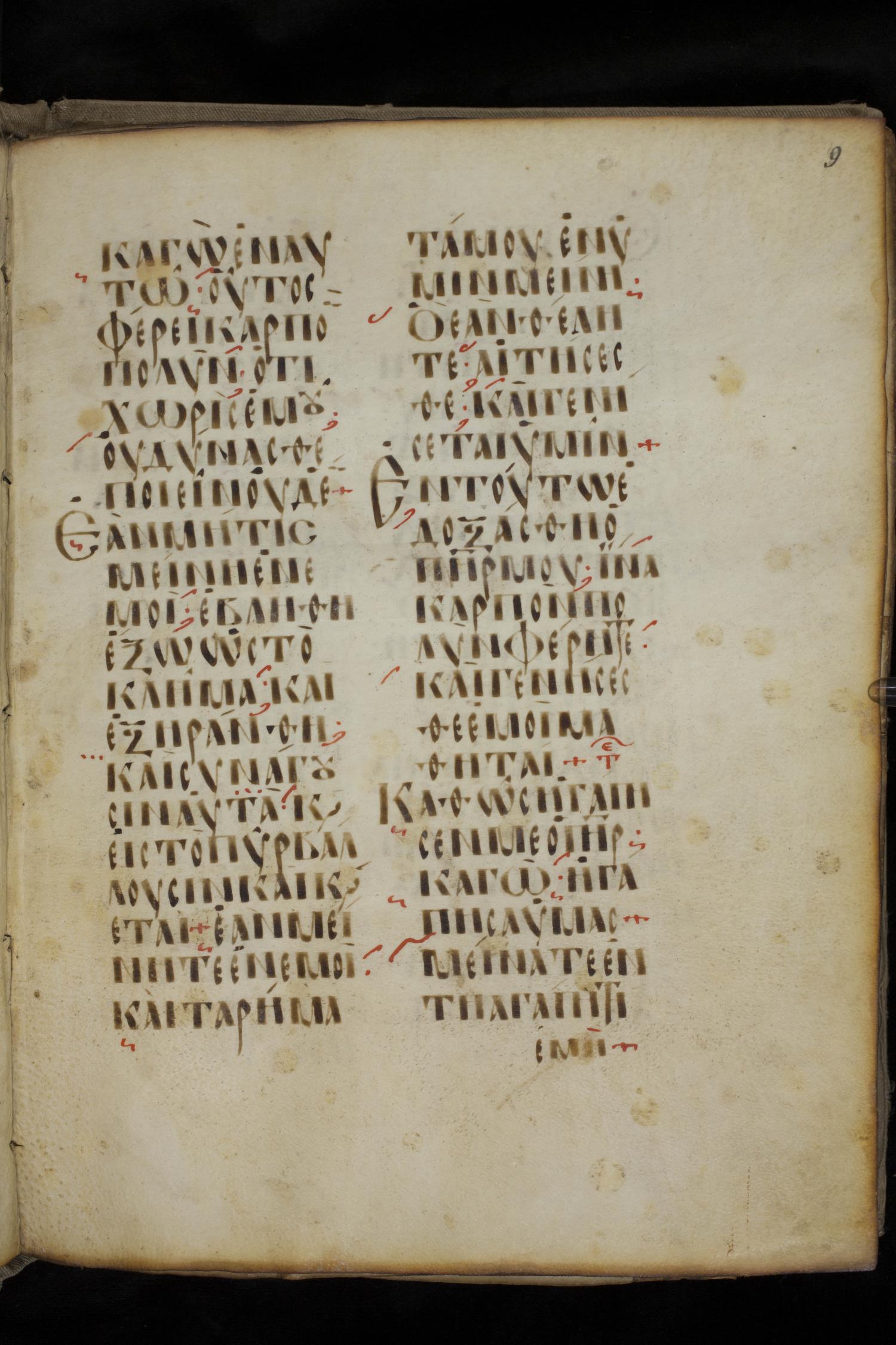 Ninth century majuscule lectionary on parchment; 88 leaves, 2 columns, 20 lines per column. Images were taken at the National Library of Greece in Athens.
