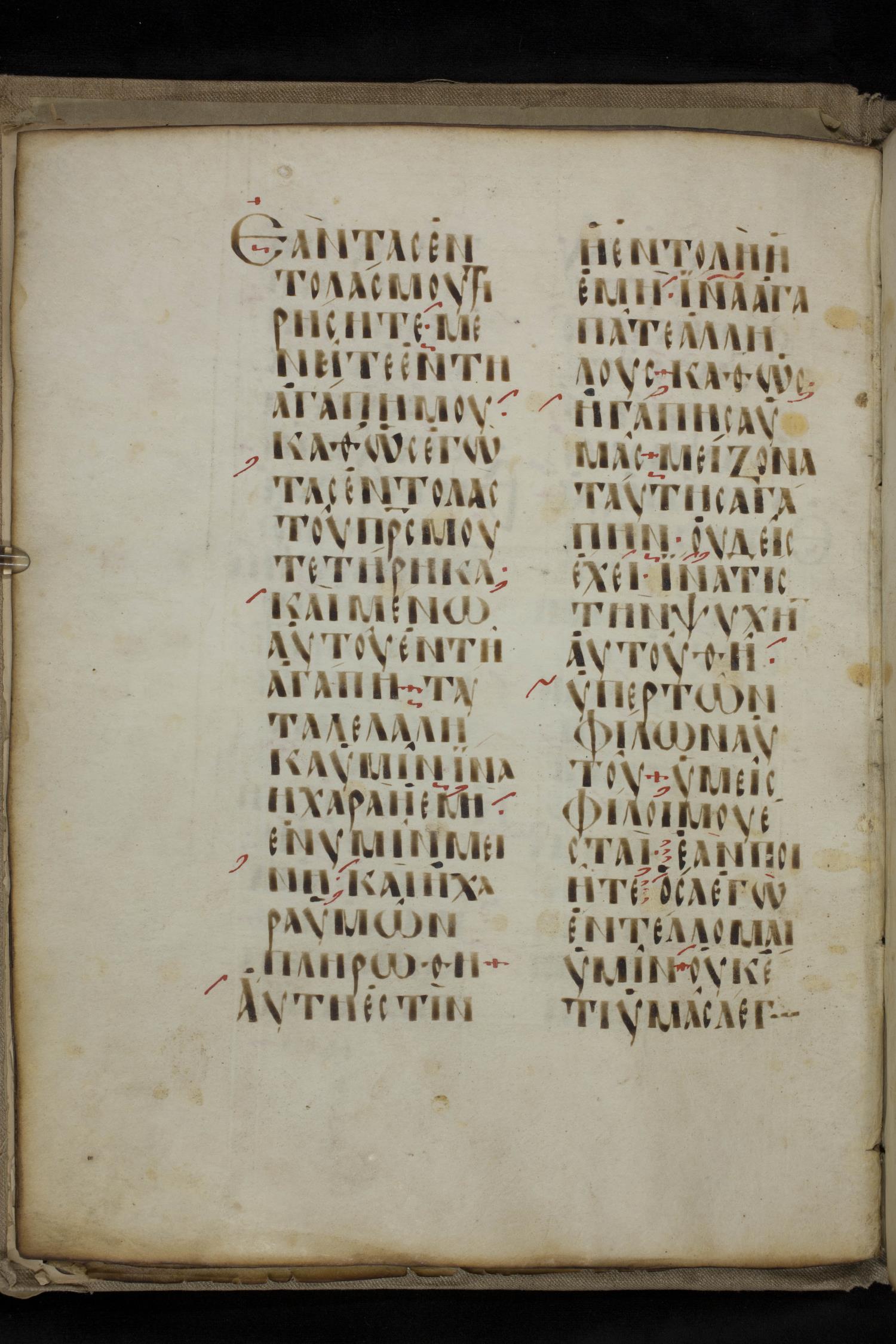 Ninth century majuscule lectionary on parchment; 88 leaves, 2 columns, 20 lines per column. Images were taken at the National Library of Greece in Athens.