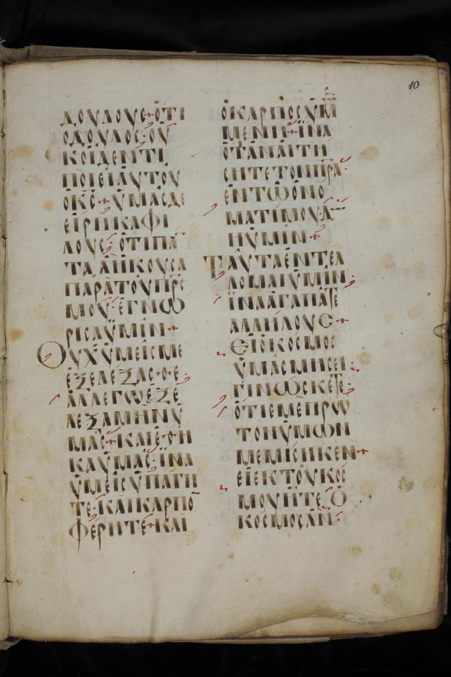Ninth century majuscule lectionary on parchment; 88 leaves, 2 columns, 20 lines per column. Images were taken at the National Library of Greece in Athens.