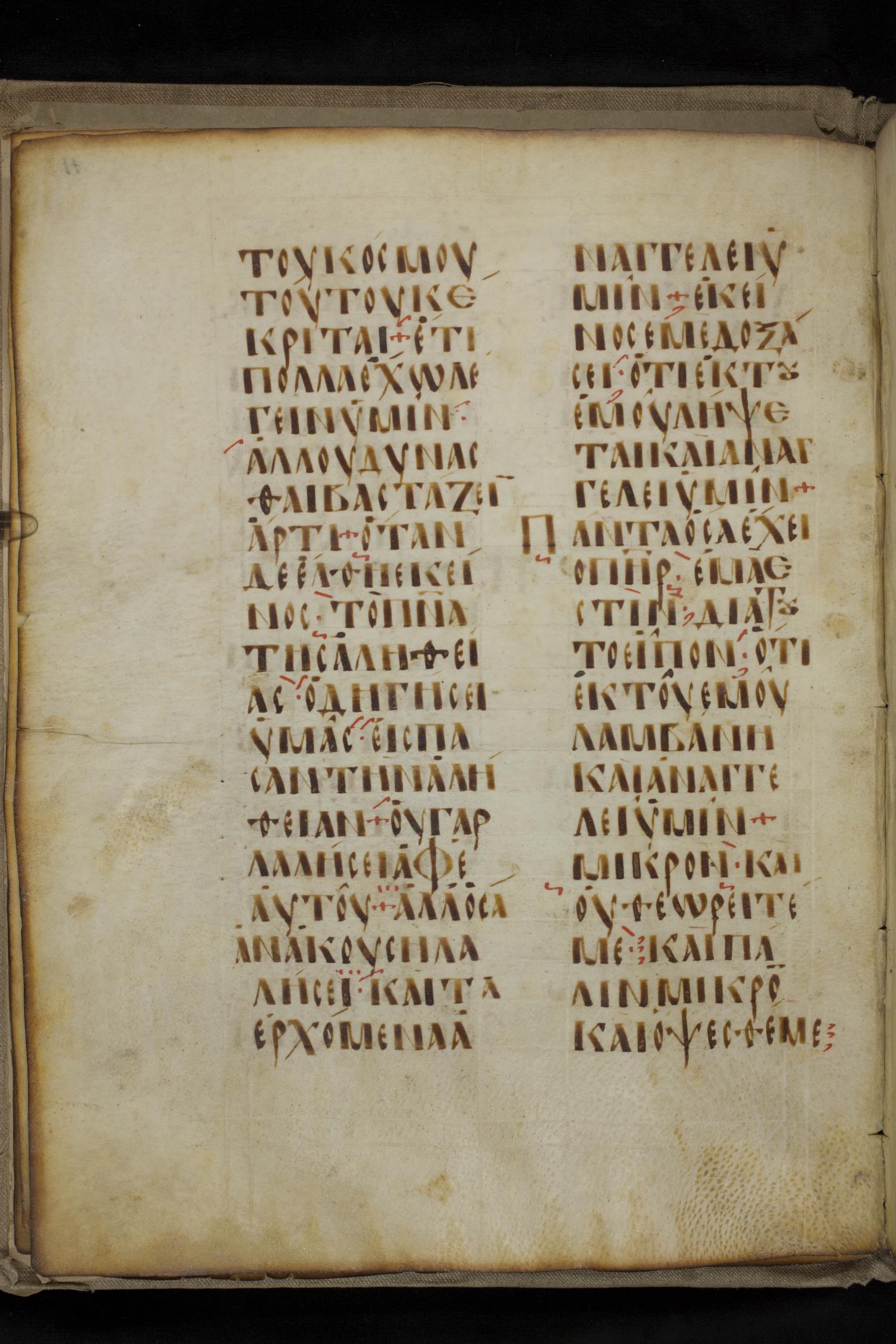 Ninth century majuscule lectionary on parchment; 88 leaves, 2 columns, 20 lines per column. Images were taken at the National Library of Greece in Athens.