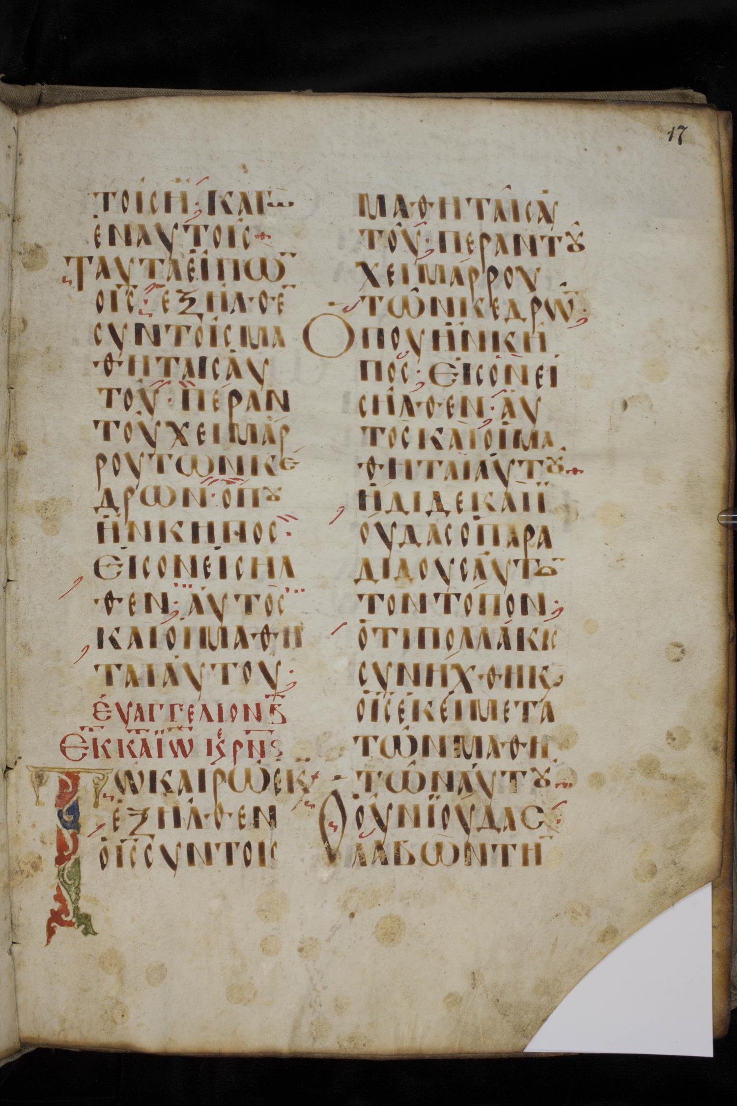 Ninth century majuscule lectionary on parchment; 88 leaves, 2 columns, 20 lines per column. Images were taken at the National Library of Greece in Athens.