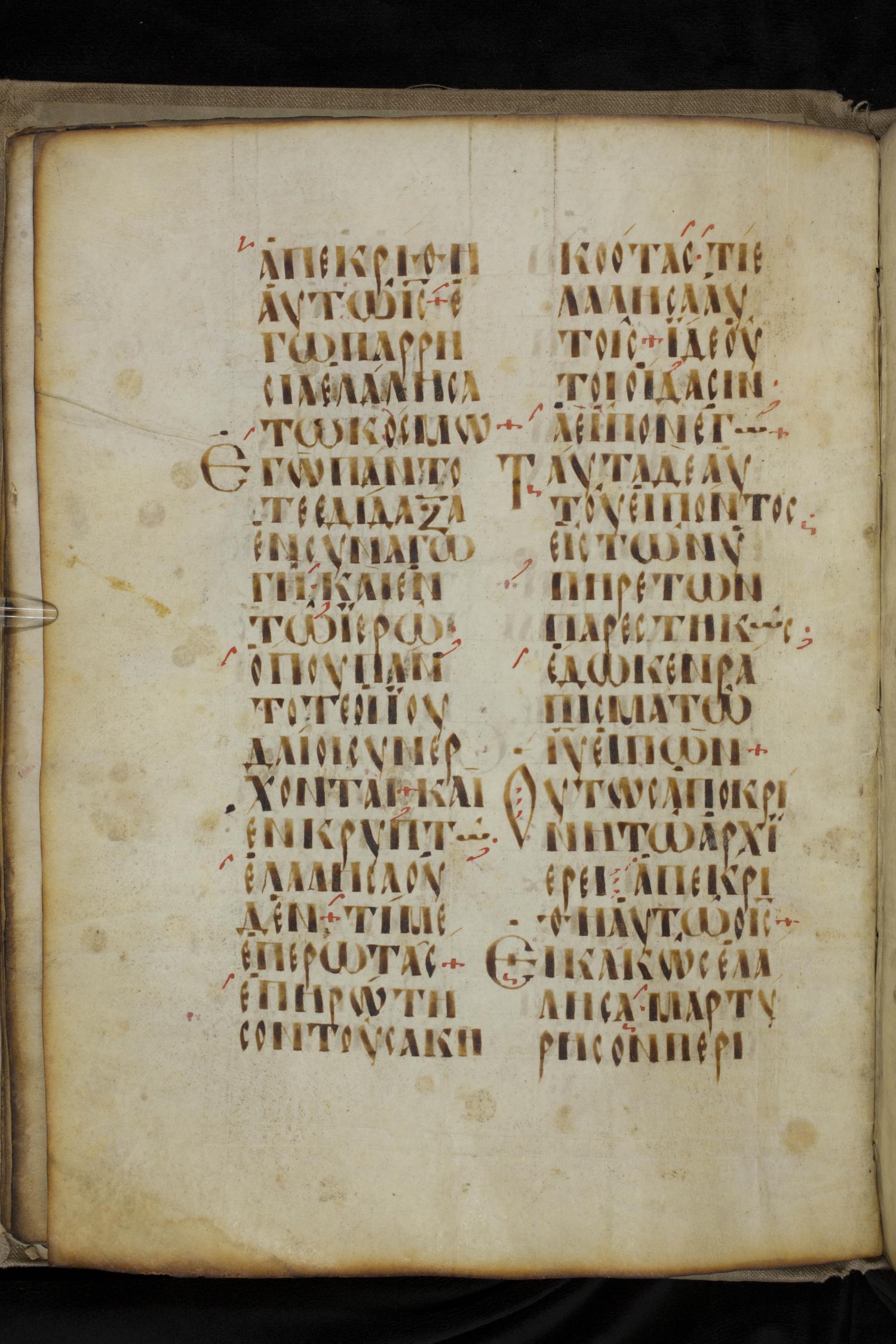 Ninth century majuscule lectionary on parchment; 88 leaves, 2 columns, 20 lines per column. Images were taken at the National Library of Greece in Athens.